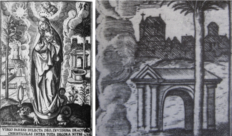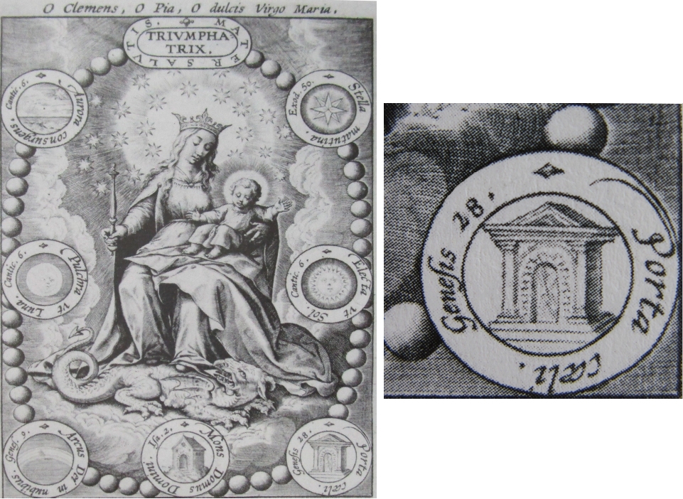 Wierix‘ Fasssung aus der Zeit um 1610 basiert auf einer Konzeption seines Kollegen Marten (Martin) de Vos (1532-1603) aus Antwerpen und wurde von Jean-Baptist Vrints ausgeführt. Der Stich (Gesamtgröße 11 x 9 Zentimeter) „Virgo parens dilecta deo, invidiosa dracon christicolas inter tota decora nites“ befindet sich heute in der Staatlichen Kunstsammlung Dresden. Auf der rechten Seite ist ein breites Himmelstor gezeichnet, dessen Schauseite mit Dreiecksgiebel zudem perspektivisch eigenartig gesetzt ist. Dahinter sieht man die Civitas Dei, die allerdings etwas dunkel geraten ist. Es ist das einzige überlieferte Beispiel, bei dem die Pforte direkt vor die Gottesstadt gesetzt ist und damit zum Stadttor wird.