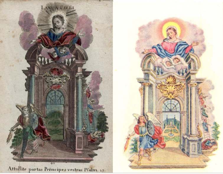 Richtig populär wurde der Stich aber in einer anderen Fassung, die die Gebrüder Klauber in ein oft aufgelegtes Buch brachten. Vornehmlich dadurch wurde diese Himmelspforte weiter verbreitet, auch in kolorierten Varianten als Andachtsbild (16 x 11 Zentimeter). 1749 erschien erstmals die „Lauretanische Litaney“ in der Fassung von Franciscus Xaverius Dornn (gest. um 1765). Der Augsburger Verleger Johann Baptist Burckhart konnte für die Ausgabe des Erbauungs- und Gebetbuchs die besten Kupferstecher seiner Zeit gewinnen, die Brüder Joseph Sebastian Klauber (1700-1768) und Johann Baptist Klauber (1712 bis nach 1787), die sich bei der Anlage des Bildes eng an Scheffler/Engelbrecht anlehnten. Entscheidender Unterschied: Hier ist das Himmelstor offen und gewährt einen verheißungsvollen Einblick in zukünftige Annehmlichkeiten.