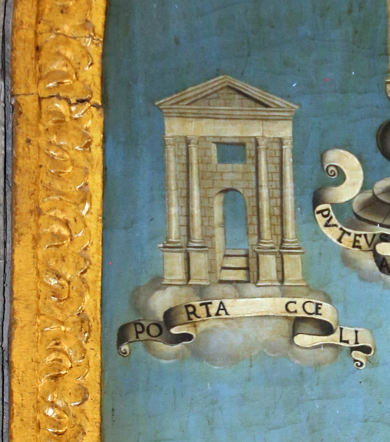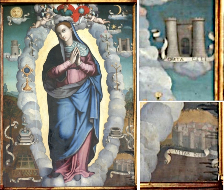 Entstanden ist das in San Francesco d’Assisi befindliche Ölgemälde um 1565. Es schmückt einen Seitenaltar der Kirche. Im oberen Bereich ist links eine geöffnete Himmelspforte zu finden. Sie besitzt Doppelsäulen und eine Treppe führt nicht zur, sondern direkt durch die Pforte. Links unten ist die Stadt Gottes angebracht, mit massiven Festungsmauern und unzähligen Häusern im Inneren. Beide Motive sind detailliert, ja verspielt ausgeführt, der Auftraggeber hatte genügend Geld für solch eine aufwendige Ausführung.
