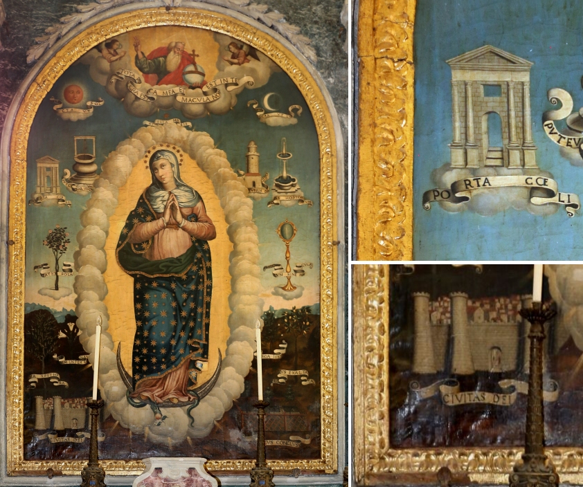San Francesco d’Assisi ist eine römisch-katholische Barockkirche im süditalienischen Matera, einer Stadt auf einer felsigen Landzunge in der Region Basilicata, wo es selbst schon so aussieht wie auf Patmos. Im Inneren der Kirche finden sich zahlreiche Malereien verschiedener Künstler des 16. Jahrhunderts. Bei einem der jüngeren Ölgemälde handelt es sich um eine typische Darstellung der Maria Immaculata mit ihren zahlreichen Symbolen, wie es in katholischen Ländern über Jahrhunderte populär war. Während wir viele Beispiele aus Frankreich und Spanien kennen, sind Immaculata-Ölgemälde aus Italien seltener. Vermutlich handelt es sich hier um eine Arbeit von Costantino Stabile aus der gleichnamigen Künstlerfamilie, die während des 16. Jahrhunderts in Süditalien Kirchen und auch Klöster mit Gemälden ausstattete. Eine ähnliche, aber schlechter erhaltene Maria Immaculata aus der Stabile-Werkstatt befindet sich übrigens in der Grottenkirche San Michele Arcangelo in Sant’Angelo a Fasanella in Kampanien, auch die spätere Deckengestaltung von San Marcello al Corso in Rom (1605) ist davon beeinflusst.