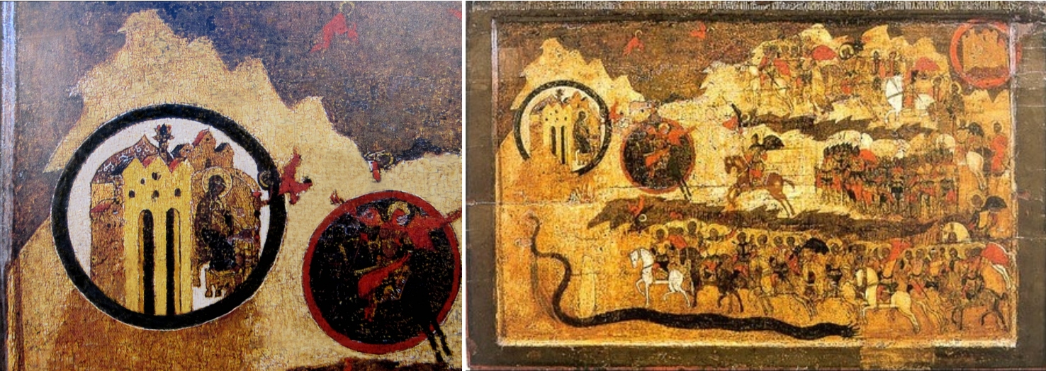 Die Ikone macht ihrem Namen alle Ehre: Die Tafel ist überzogen mit Kampfesgewühl und bewaffneten Rittern. Das Himmlische Jerusalem oben links ist durch einen vierfachen konzentrischen Nimbus (eine Mischung zwischen Mandorla und Regenbogen) von diesen Kampfszenen abgegrenzt. Auf einem felsigen Hügel stehen drei Tortürme, die die Kenntnis italienischer Vorbilder vermuten lassen, nämlich die Darstellung des Neuen Jerusalem in der römischen Basilika S. Giovanni in Laterano aus dem späten 13. Jahrhundert (Original Verlust, Kopie vorhanden). Rechts von diesen drei Toren erscheint Maria mit dem Jesuskind, das von einem Engel eine gerettete Seele empfängt. Hinter dieser Szene steht ein Rundbau, der das eigentliche Neue Jerusalem darstellen soll. Die linke Seite ist rot, die rechte Seite blau; dazwischen schiebt sich ein mit Bäumen bewachsener Felskeil, zu dessen Fuß der Fluss des Lebens entspringt und sich nach unten schlängelt.