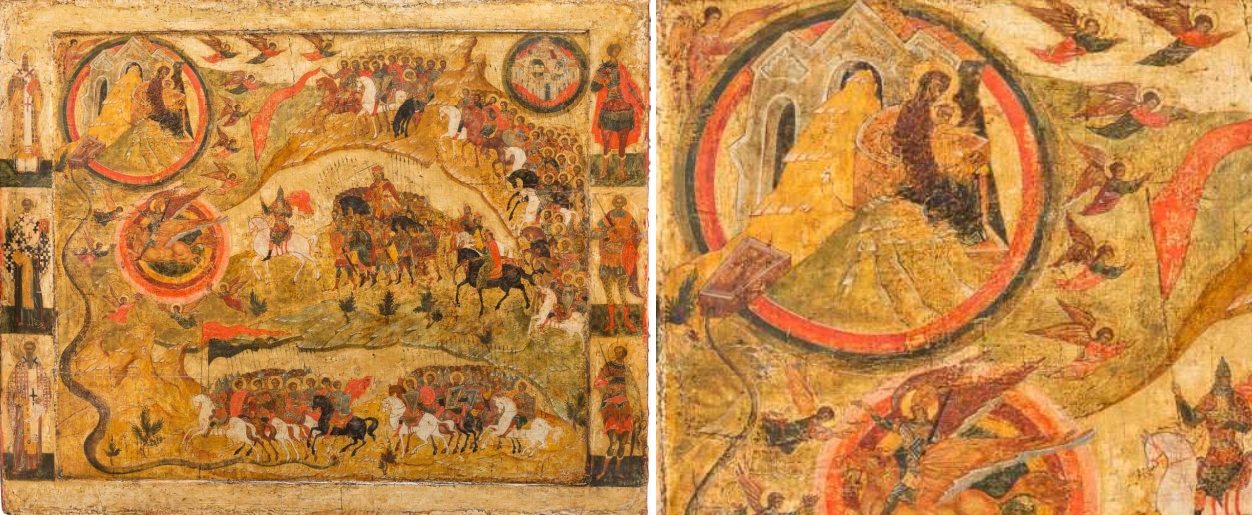 Etwa im Jahre 1555 wurde eine horizontal ausgerichtete Ikone (insg. 396 x 133 Zentimeter) vollendet, die in der Literatur später als „Die Kirche auf dem Kreuzzug“ oder „Die streitbare Kirche“ etwas bekannter wurde. Das sakrale Kunstwerk stand einst in der Mariä-Entschlafens-Kathedrale im Moskauer Kreml; heute befindet es sich in der Tretjakow-Galerie, ebenfalls in Moskau. Sie wurde mit Eierfarben auf Holz gemalt.