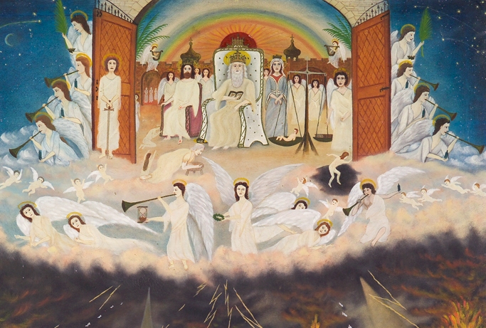 Ungewöhnlich ist hier, was sich um die schwebende Himmelsstadt abspielt. Oben erscheint in einem Wolkennimbus ein Altar, rechts daneben das Agnus Dei. Unten ist die Himmelfahrt des Elias zu sehen, der seinen Mantel zu seinem Nachfolger wirft – die Darstellung des Feuerwagens darf als ein früher Beleg für die Aufnahme dieses Sujets in den endzeitlichen Kontext gelten; der Wagen wird seit dem frühen 17. Jahrhundert im Pietismus vermehrt mit dem Himmlischen Jerusalem in Verbindung gebracht. Links und rechts flankieren zwei Allegorien – Spes/Hoffnung (Anker) und Patientia/Geduld (Lamm) – die Titelaufschrift.