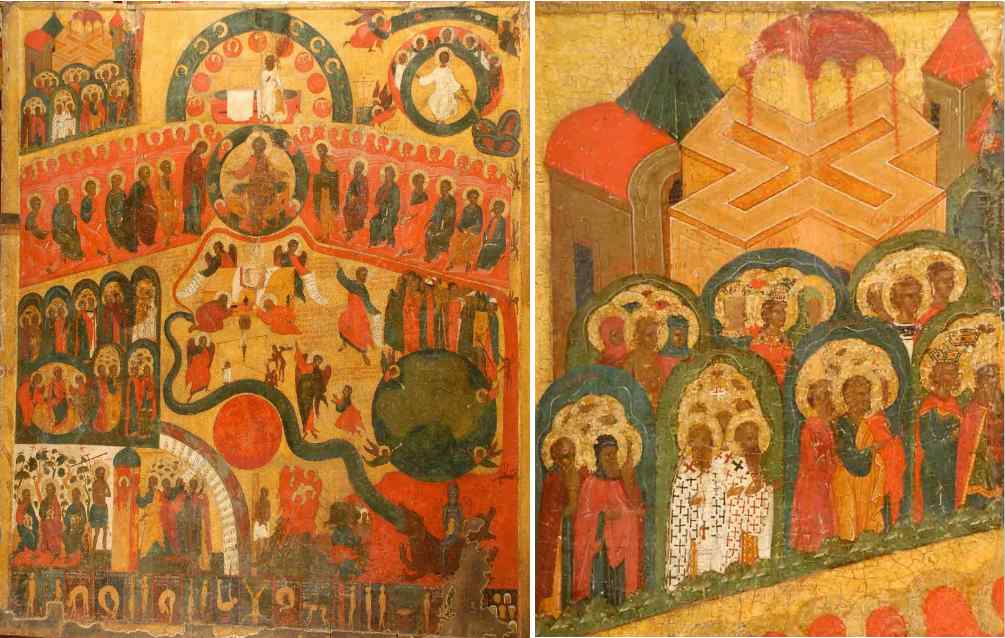 Weltgerichtsikone mit Baldachin aus der Tretjakow-Galerie in Moskau (um 1450), Kopien aus Pskow (1547), 19. Jh., sowie in in Beit HaGalil (2000) und Colorado Springs (2002)