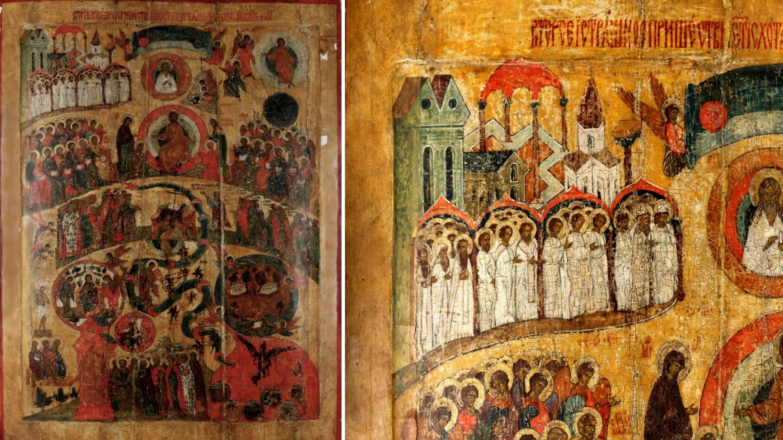 Eines der bekanntesten und auch ältesten Beispiele einer russischen Weltgerichtsikone zeigt das Neue Jerusalem auf der linken, oberen Seite eines Jüngsten Gerichts. Im unteren Bereich sind Gruppen von Heiligen zusammengestellt. Alle sind in weiße Gewändern gekleidet. Darüber ist eine Architektur gesetzt, die die Kenntnis oberitalienischer Bauten der Lombardei verrät. In der Mitte befindet sich ein leerer Thron mit einem hoch gespannten Baldachin – ein Platz, der Christus vorbehalten ist.