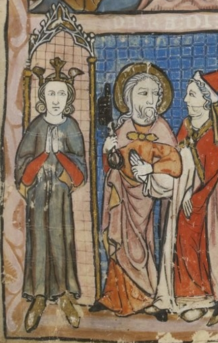 Die Malerei zeigt in der Mitte eine Kreuzigungsszene, darunter die irdische Welt (hier nicht wiedergegeben). Oben dagegen zeigt sich die zukünftige Welt, rechts die Hölle, links das Himmlische Jerusalem (siehe Bild). Von diesem Jerusalem ist in den Wolken eine offene Pforte in Barockformen zu sehen, hinter der einige Menschen im Profil eingezeichnet sind. Es sind wohl Heilige, die in zwei Reihen auf Bänken oder Stühlen sitzen. Auszumachen ist darunter Petrus, an seinem Schlüsselbund gut zu erkennen. Es ist eine der wenigen Malereien, bei der Petrus hinter, und nicht vor der Pforte zu finden ist. Diese Pforte steht weit offen, man sieht deutlich beide Flügel. Da nun der Hintergrund ebenso vergoldet ist wie die Binnenzeichnungen, sind Einzelheiten kaum zu erkennen. Das jedoch ist kein Zufall, sondern ist bewusst so gewollt: Den Menschen ist es noch nicht gestattet, vollen Einblick in die Göttliche Welt zu nehmen.