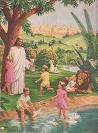 Eine der letzten Illustrationen der göttlichen Stadt von Clyde Provonsha wurde 1967 in einer Neuausgabe von „Bible Readings for the Home“ gedruckt (Seite 547). Im Vordergrund befindet sich eine Personengruppe; es ist Jesus mit Kindern. Er hat übrigens die gleichen Gesichtszüge wie in der Zeichnung von 1953. Ihm gegenüber steht ein Ehepaar mit seinem ältesten Sohn. Die Mutter, die andächtig die Hände faltet, hat Züge Mariens, wie überhaupt das Ehepaar Maria und Joseph als Idealbild der christlichen Familie verklärt wurde. Darüber vergisst man schnell die Stadt im Hintergrund links, von der sich im hellen Licht allein die Umrisse ausmachen. Es sind jetzt blockartige Gebäude, von denen ein Turm in Form eines Hochhauses mit Kuppel herausragt. Vorne zeichnet sich noch ein antiker Tempel ab, dessen Säulenportikus man erkennen kann, da die Stadt nicht von einer Mauer umzogen ist. Inzwischen hatte sich die Mode geändert, auch Norman Brice (1948) Charles Zingaro (1953) oder Lester Quade (1953) propagierten diese moderne Variante.