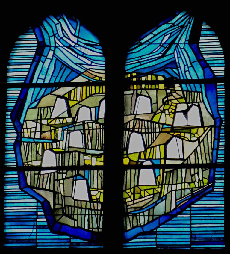 Für die Markuskirche gestaltete Yelin drei Chorfenster. Aufgabe war es, den spätgotischen Kruzifixus, der von der Südwand in die Mitte des Chors gebracht wurde, mit österlichen Fensterbildern zu hinterlegen. Erschwerend kam die vor dem Altar stehende Orgel hinzu, die Teile des Fensters verdeckte, so dass alle Motive in den oberen Bereich gesetzt werden mussten. Die Botschaft des Chors soll der „für uns gekreuzigte und auferstandene Christus“ sein. Dazu zeigte Yelin die Himmelfahrt Christi ins Neue Jerusalem, dargestellt durch eine horizontale Agglomeration einzelner Bauten, zum Teil mit Fenstern und Torbögen. Auch die Arkaden sind wieder dabei, die man bereits in Stuttgart-Möhringen (1949) oder auch in Stuttgart-Gablenberg (1951) findet. Die hell- und dunkelbraunen Bauten sind nicht durch eine Mauer verbunden, sondern durch weiße Scheiben, die eine Art Wolke ergeben. Wenn auch die Tore hier nicht dargestellt sind, so hat der Künstler ihre Zahl aufgegriffen, indem er ein Dutzend Baukörper aneinander reihte, von denen einige bereits Toren ähneln. Diese Tendenz, statt der Bauten die Tore der Stadt darzustellen, sollte sich bei den folgenden Glasfenstern Yelins fortsetzen.