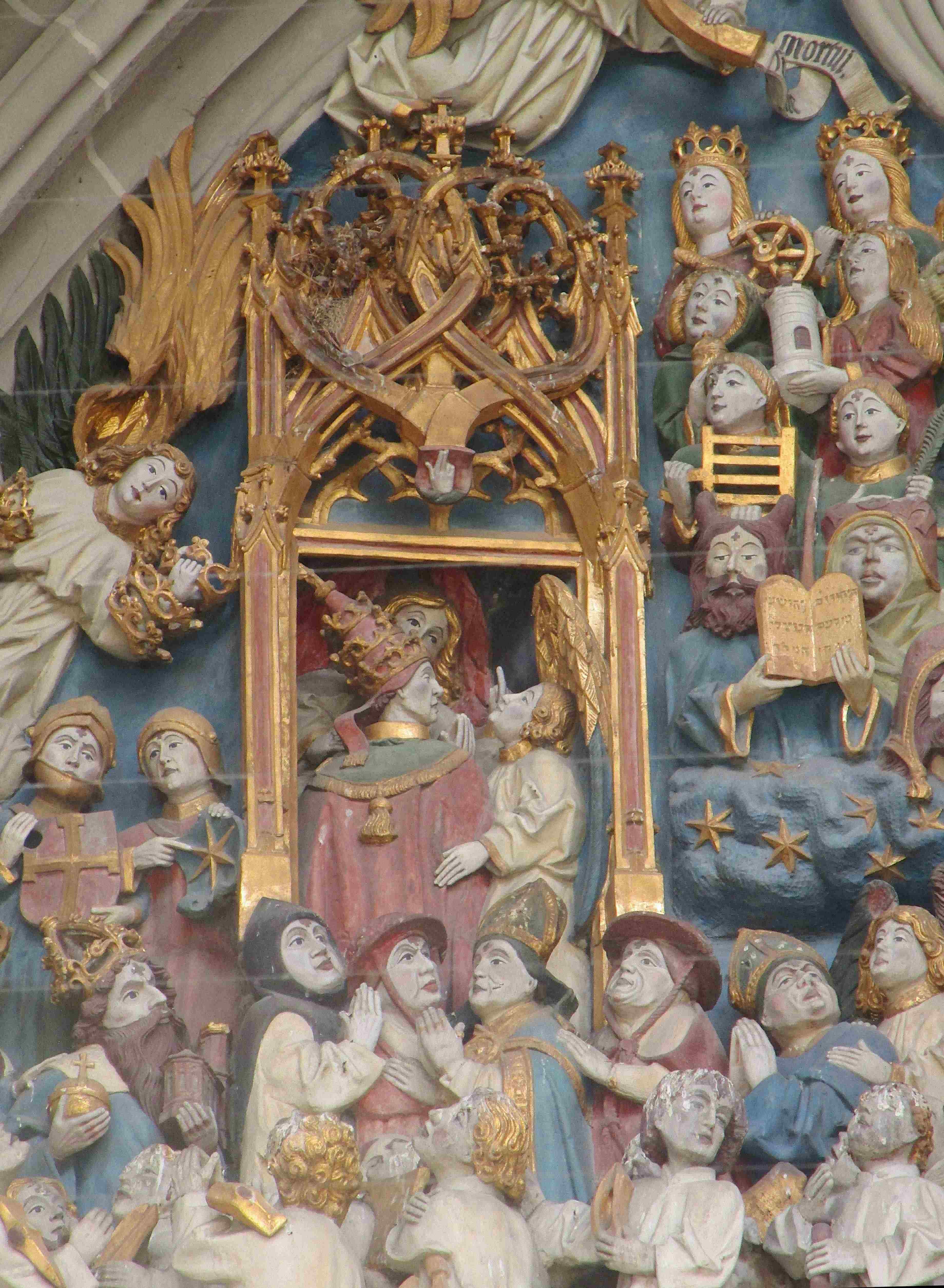Das spätgotische Hauptportal des Berner Münsters zeigt das Himmlische Jerusalem auf der linken Seite eines umfangreichen und vielgestaltigen Weltgerichts mit zahlreichen biblischen und historischen Heiligen, Engeln und Teufeln. Jerusalem wurde hier nicht als komplette Stadt dargestellt, sondern lediglich pars pro toto als Torszene, wenngleich auch künstlerisch aufwendig, vor allem wegen des in sich verschobenen Maßwerks. Dieses Maßwerk wurde wie eine königliche Krone geformt. Es ist dem Flamboyant-Stil anlehnt, der für jeden Steinmetz oder Schnitzer eine besondere Herausforderung darstellte. Das Material ist lokaler Berner Sandstein. Geschaffen wurde es vermutlich von dem Bildhauer Erhart (auch Erhard) Küng (geb. um 1420-1507) und bzw. oder seinen Gehilfen, um das Jahr 1485. In das Tor rettet sich ein Papst durch den Haupteingang, der durch seine machtvolle Tiara fast am Betreten gehindert wird. Diese Tiara setzt sich aus mehr als fünf einzelnen Kronen zusammen. Männlichen Klerikern aller Art folgen dem Papst; Engel helfen den Menschen zum Teil, in das Innere zu gelangen. Bemerkenswert ist, dass die Vertreter der Stände sich hier in eine geistliche Reihe rechts und eine weltliche Reihe links aufteilen – das ist kaum anderswo so zu finden. Auch ist es das vielleicht früheste Beispiel für einen Zugang in das Himmlische Jerusalem, der ein eigenes Wappen führt. Hier ist es eine Schwurhand. Diese gehört nicht zu einer lokalen Adelsfamilie, sondern es ist ein Verweis auf die Hand Gottes.