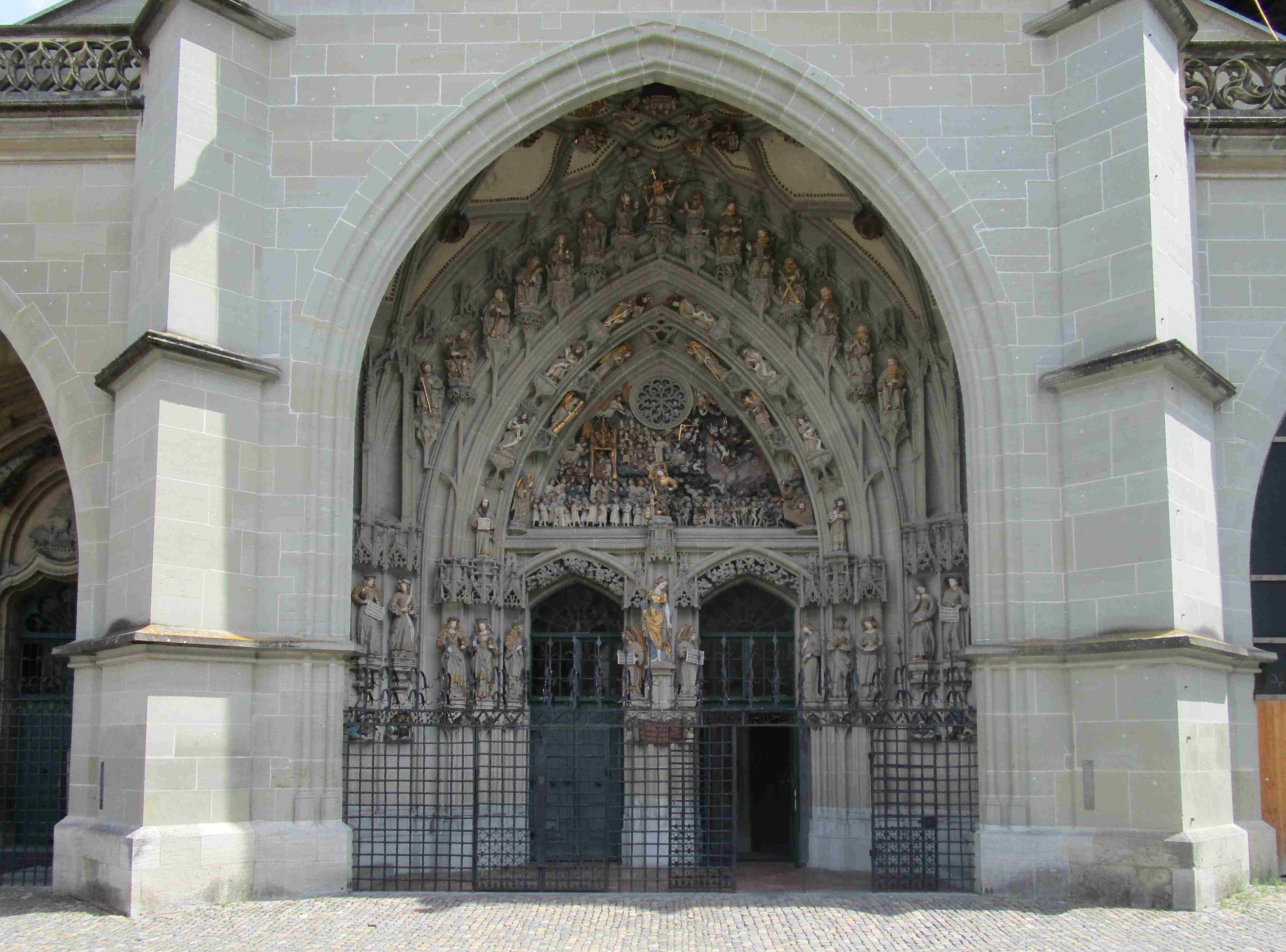 Das spätgotische Hauptportal des Berner Münsters zeigt das Himmlische Jerusalem auf der linken Seite eines umfangreichen und vielgestaltigen Weltgerichts mit zahlreichen biblischen und historischen Heiligen, Engeln und Teufeln. Jerusalem wurde hier nicht als komplette Stadt dargestellt, sondern lediglich pars pro toto als Torszene, wenngleich auch künstlerisch aufwendig, vor allem wegen des in sich verschobenen Maßwerks. Dieses Maßwerk wurde wie eine königliche Krone geformt. Es ist dem Flamboyant-Stil anlehnt, der für jeden Steinmetz oder Schnitzer eine besondere Herausforderung darstellte. Das Material ist lokaler Berner Sandstein. Geschaffen wurde es vermutlich von dem Bildhauer Erhart (auch Erhard) Küng (geb. um 1420-1507) und bzw. oder seinen Gehilfen, um das Jahr 1485. In das Tor rettet sich ein Papst durch den Haupteingang, der durch seine machtvolle Tiara fast am Betreten gehindert wird. Diese Tiara setzt sich aus mehr als fünf einzelnen Kronen zusammen. Männlichen Klerikern aller Art folgen dem Papst; Engel helfen den Menschen zum Teil, in das Innere zu gelangen. Bemerkenswert ist, dass die Vertreter der Stände sich hier in eine geistliche Reihe rechts und eine weltliche Reihe links aufteilen – das ist kaum anderswo so zu finden. Auch ist es das vielleicht früheste Beispiel für einen Zugang in das Himmlische Jerusalem, der ein eigenes Wappen führt. Hier ist es eine Schwurhand. Diese gehört nicht zu einer lokalen Adelsfamilie, sondern es ist ein Verweis auf die Hand Gottes.