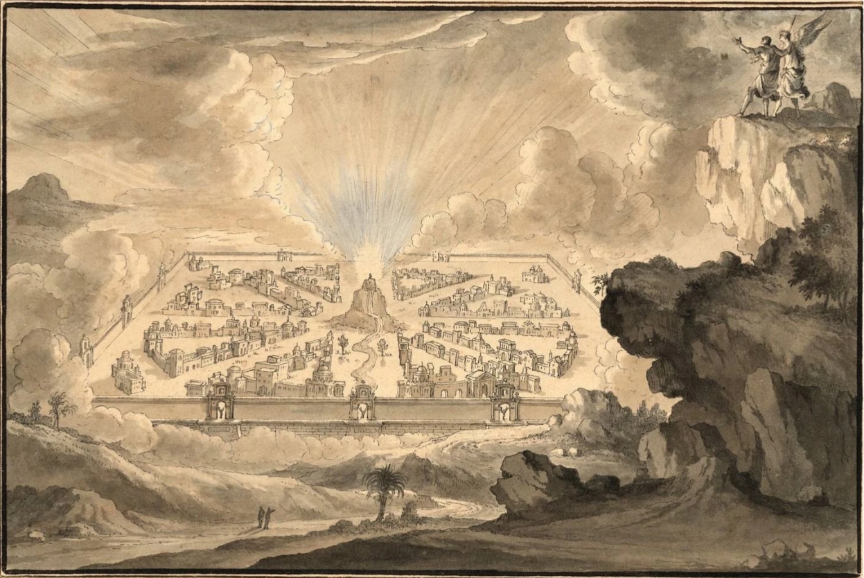Eine Kopie aus der Mortierbibel ist diese Abbildung der Himmelsstadt aus der „Biblia das ist die ganze Heil. Schrift Alten und Neuen Testamentes“, die 1755 im mittelfränkischen Onolzbach im Verlag von Heinrich Gottlob Billing und Johann Jacob Endert erschienen war. „Onolzbach“ ist ein älterer, heute nicht mehr gebräuchlicher Name für Ansbach, in dem es Dank der markgräflichen Residenz eine gewisse Kultur- und Kunstförderung gab, von der auch der Buchdruck profitierte.