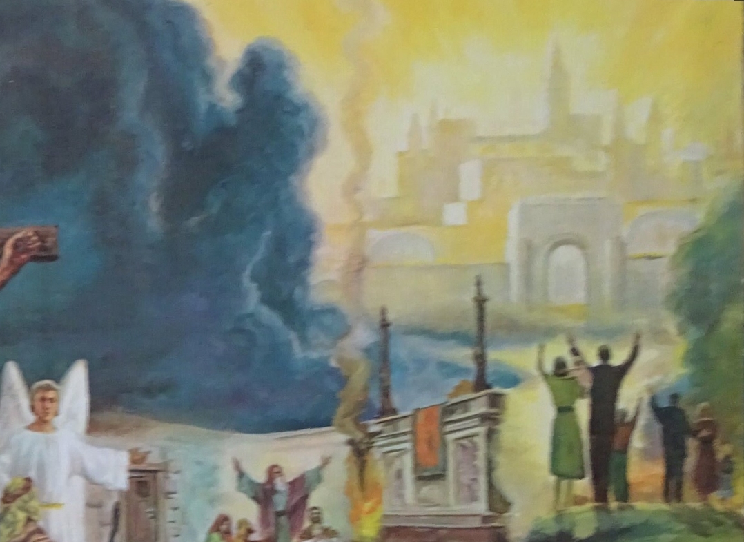 Die Bildkonzeption findet sich auch in der überarbeiteten Neuauflage von „Bible Readings for the Home“ aus dem Jahr 1962. Die Illustration wird leicht übersehen, denn sie findet sich erst ganz am Schluss des Bandes auf der Innenseite des Backcovers, über zwei Seiten hinweg. Größter Unterschied zu den Vorgängerfassungen ist, dass der Baum durch eine dunkle Wolke ersetzt wurde. Die Stadt im rechten Bildhintergrund zeigt sich ähnlich wie bei Quade als gelb-weiße Lichterscheinung. Hinter einer Mauer mit einem Haupttor erheben sich Baukörper nach oben; Einzelheiten bleiben verborgen. Wer die Farbillustrationen zu dem Band erarbeitet hat, kann letztlich nicht immer entschieden werden, da zahlreiche Künstler an der Neuauflage mitwirkten, zum Teil auch aus dem Bildbestand der Southern Publishing Association und der Pacific Press Publishing Association stammen. In diesem Fall ist aber das Bild unten rechts handschriftlich signiert; es ist ein Werk von Joe Maniscalco (1925-2006).