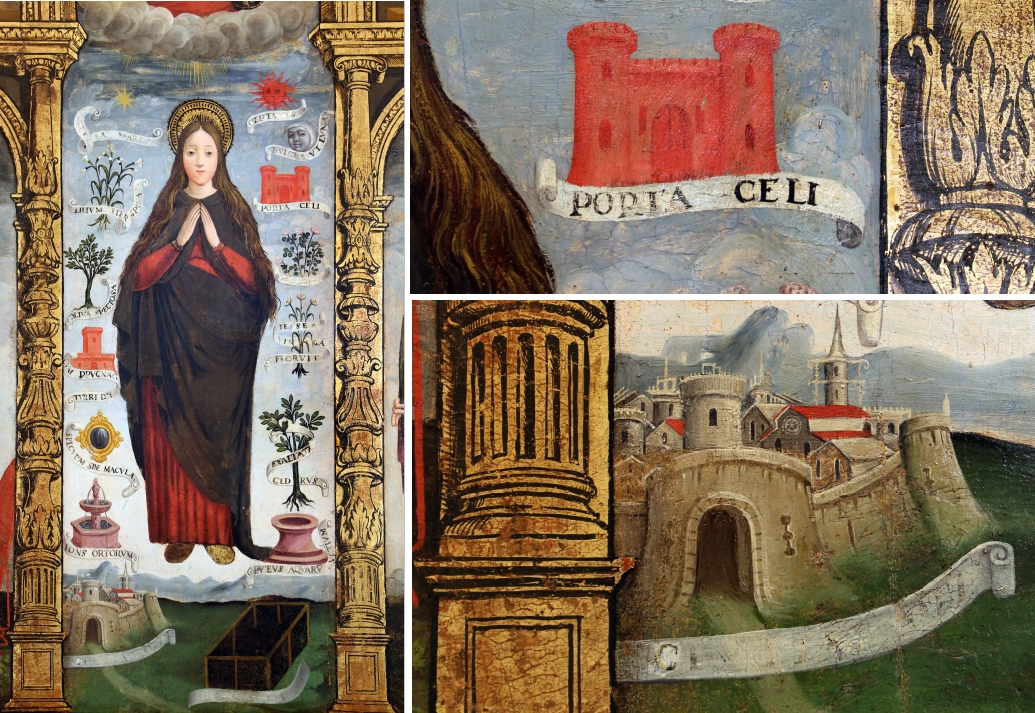 Beide Symbole, die traditionsgemäß für die Gottesstadt stehen, sind dank eines jeweiligen lateinischen Schriftbandes eindeutig zuzuweisen, wenngleich auch die Buchstaben „Civitas Dei“ inzwischen fast gänzlich verblasst sind. Eine Restauration des Werkes ist, laut Auskunft der Galerie, angedacht. Wenn das Gemälde tatsächlich Ende des 15. Jahrhunderts entstanden sein sollte, wäre es die früheste erhaltene Repräsentation der Symbole Mariens im Rahmen der Lauretanischen Litanei in ganz Italien. Wichtige Druckwerke mit diesem Genre waren noch gar nicht erschienen, so dass man in diesem Gemälde einen Vorläufer und Ideengeber weiterer Immaculata-Darstellungen vermuten darf.