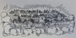 S. 95 zeigt noch einmal die Himmelsstadt als „Heim der Erlösten“, diesmal ohne kriegerische Szenen. Hier sind mehrere individuelle Wohnbauten über einer Wolkenformation wiedergegeben, Türme und Tore hingegen spielen eine untergeordnete Rolle. Die Stadt ist mit vielen Flachbauten versehen, was an ein Pueblodorf erinnert. Zwischen den Häusern erscheinen immer wieder Pflanzen – die einfache Zeichnung erinnert sehr an ein ähnliches Werk von Ludwig Richard Conradi (1856-1939), nämlich „Prophetischer Ausblick auf Zeit und Ewigkeit“ (1918). In beiden Fällen ist der Künstler nicht genannt und kann auch nicht zugewiesen werden.