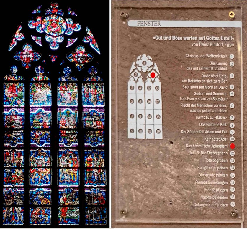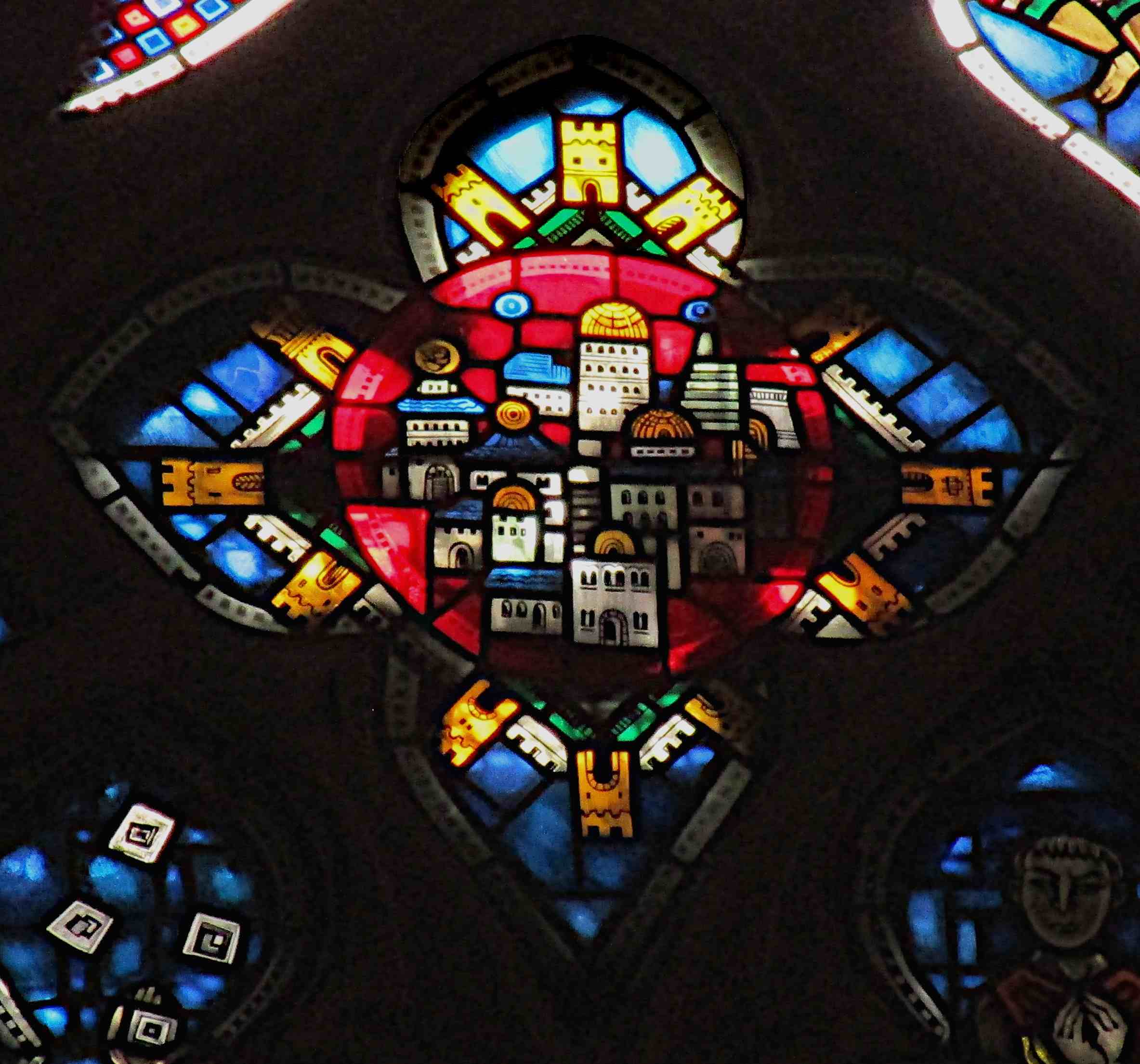 Die neue Arbeit von Hindorf präsentiert die Stadt noch deutlicher als 1967 als das Neue Jerusalem. Der Künstler zeigt auf dem ebenfalls vierbahnigen Fenster oben rechts den Ort, wohin diejenigen kommen, die während ihres Lebens gute Taten ausführten, wie Hungernde speisen, Gefangene besuchen oder Kranke pflegen. Erneut finden sich zahlreiche Bauten in einem roten Tondo. Diesmal ist die Kreisform der Stadt jedoch von Mauer und Türmen umzogen. Mit den zwölf Toren und der quadratischen Mauer ist die Stadt eng wie im Bibeltext beschrieben gehalten. Mit Zinnen und kleinen Fenstern sind es mittelalterliche Anklänge, in denen die Stadtmauern gezeigt werden. Hergestellt und eingebaut wurden die Fenster im Jahr 1989 von der Werkstatt für Glasmalerei Dr. Heinrich Oidtmann aus Linnich.