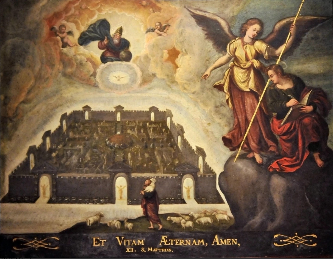 Auf um 1570 wird dieser Kupferstich datiert, den Marten (Martin) de Vos (1532-1603) geschaffen hat. Der flämische Verleger John Baptista Vrints gewann dann Julius Goltzius dafür, die Vorlage des Marten de Vos in Antwerpen zu stechen: „Vitam Aeternam“ war geboren. Die beiden, also de Vos und Goltzius, erfanden eine Fassung, die genau den Zeitgeschmack traf und als „Vitam Aeternam“ („ewiges Leben“) einen Siegeszug ohnegleichen antrat. Wie wir sehen werden, wurde „Vitam Aeternam“ sogar in der Ostkirche aufgenommen und fand Verbreitung in Latein- und Südamerika. Ein Grund war, dass die Illustration in einer leicht veränderten Fassung 1643 in den Sammelband „Theatrum Biblicum“ des Verlegers Nikolaus Johannes Piscator (i. e. Claes Jansz Visscher der Jüngere, 1587-1652) aufgenommen wurde, was ihre Verbreitung im 17. Jahrhundert weiter beförderte. Es ist kaum zu glauben, dass diese Zusammenhänge in der Kunstwissenschaft bislang nicht beachtet wurden – vermutlich, weil das Bildmotiv „Himmlisches Jerusalem“ im Zusammenhang wenig erforscht ist.
