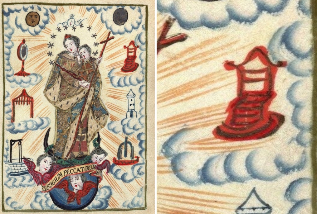 Bei dieser kolorierten Zeichnung befindet sich eine rote Himmelspforte mit einigen Stufen oben rechts, unterhalb eines silbergrauen Mondes. Würde aus der Position des Objekts und der Tradition nicht hervorgehen, dass es sich um die Porta Coeli handelt, könnte man auch an den Sedes Sapientiae denken. Der chinoise Einfluss ist bei dieser Arbeit aus Flandern unverkennbar. Es handelt sich um eine Canivet aus der zweiten Hälfte des 18. Jahrhunderts, um 1760. Canivets sind kleine gestickte oder gezeichnete Andachtsbilder, die in frommen katholischen Kreisen zu persönlichen Andachtsbüchern zusammengestellt werden konnten. Die Bildchen wurden bewusst anonym hergestellt, was ihre mystische, überindividuelle Aura verstärkt.