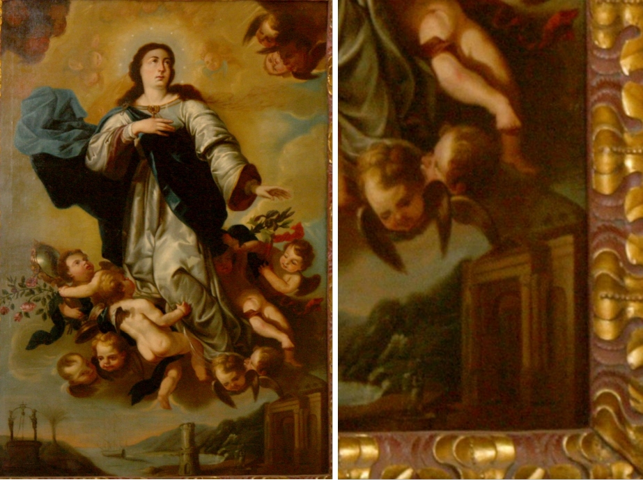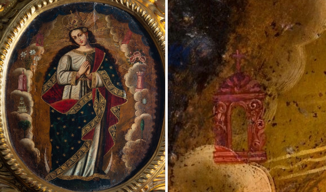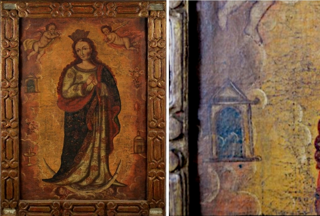 Diese Malerei wird in der Sammlung der Universität von Barcelona aufbewahrt (Inventarnummer 1143A). Entstanden ist das 212 x 137 große Bild um 1750 vermutlich in Madrid. Der Aufbau ist für eine Barockmalerei klassisch und steht in der Nachfolge von Bartolome Esteban Murillo und von Francisco de Solís. Ungewöhnlich ist, dass die Marienfigur hier nicht Ruhe und Verlässlichkeit ausstrahlt, sondern wie getrieben durch das Bild weht. Ihre Mondsichel, auf der sie mehr kniet als steht, ist ganz nach rechts gerückt und seht direkt über der Himmelspforte, dem größten einiger Mariensymbole, die sich fast alle am unteren Rand finden (Ausnahme Marienspiegel). Rechts ist es eine massive Pforte, hinter der ein weiteres Bauwerk angrenzt. Es kann sich also um eine Himmelspforte mit weiterer Architektur handeln, allerdings ebenso um das Domus Aurea. Da die Symbole im 18. Jahrhundert gewöhnlich nicht mehr mit einem lateinischsprachigen Schriftband versehen wurden, ist die Zuweisung weniger eindeutig.