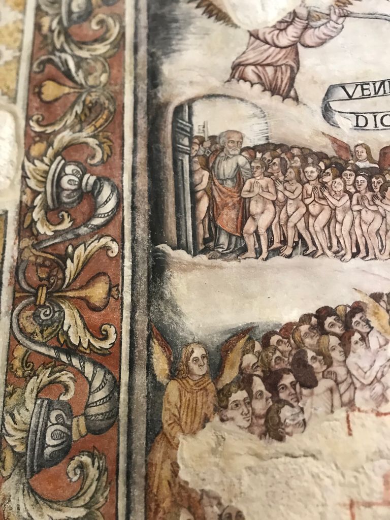 Es scheint Eile geboten: Petrus und ein Engel packen die auf den Stufen von unten Ankommenden an ihren Gewändern und drängen sie durch die Pforte in Sicherheit. Nach anderer Interpretation wird hier gezeigt, wie die nackt ankommenden Menschen mit neuen, goldenen Gewändern ausgestattet werden.