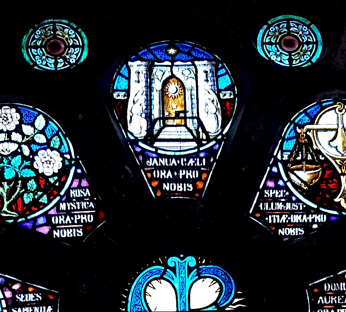 James Watson & Co. produzierte dieses Glasfenster mit minimalen Änderungen ein weiteres Mal, wenige Jahre nach Escaheen. Vor allem die einzigartige Türfüllung mit der flammenden Sonne und den Sternen darunter findet sich wieder, auch die beiden knienden Engel an den Seiten des Eingangs findet man, sogar der singuläre Stern über der Pforte wurde kopiert. Da man in diesem Rundfenster weniger Raum zur Verfügung hatte, mussten die beiden Seitentürme wegfallen. Dieses Mariensymbol ist beschriftet: „Janua Caeli“ sowie „Ora Pro Nobis“ findet man unter der Rundung. Es handelt sich bei dem Detail um einen Ausschnitt eines größeren Rundfensters, welches in acht solchen Ausschnitten jeweils ein Symbol nach der Lauretanischen Litanei auf der neogotischen Rosette des Westgiebels zeigt. Dasjenige Symbol mit der Pforte ist sinnigerweise das erste bzw. letzte Symbol, wo auf einem Ziffernblatt 0 bzw. 12 Uhr angezeigt wird. Das Fenster wurde 1911 in die römisch-katholische Kirche des Ortes Monea (damals noch Irland, heute Nordirland) eingebaut. Der Neubau wurde „Immaculate Conception“ getauft, die künstlerische Hommage an Maria war also auch im Namen begründet.