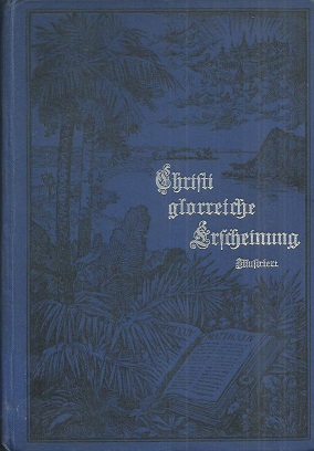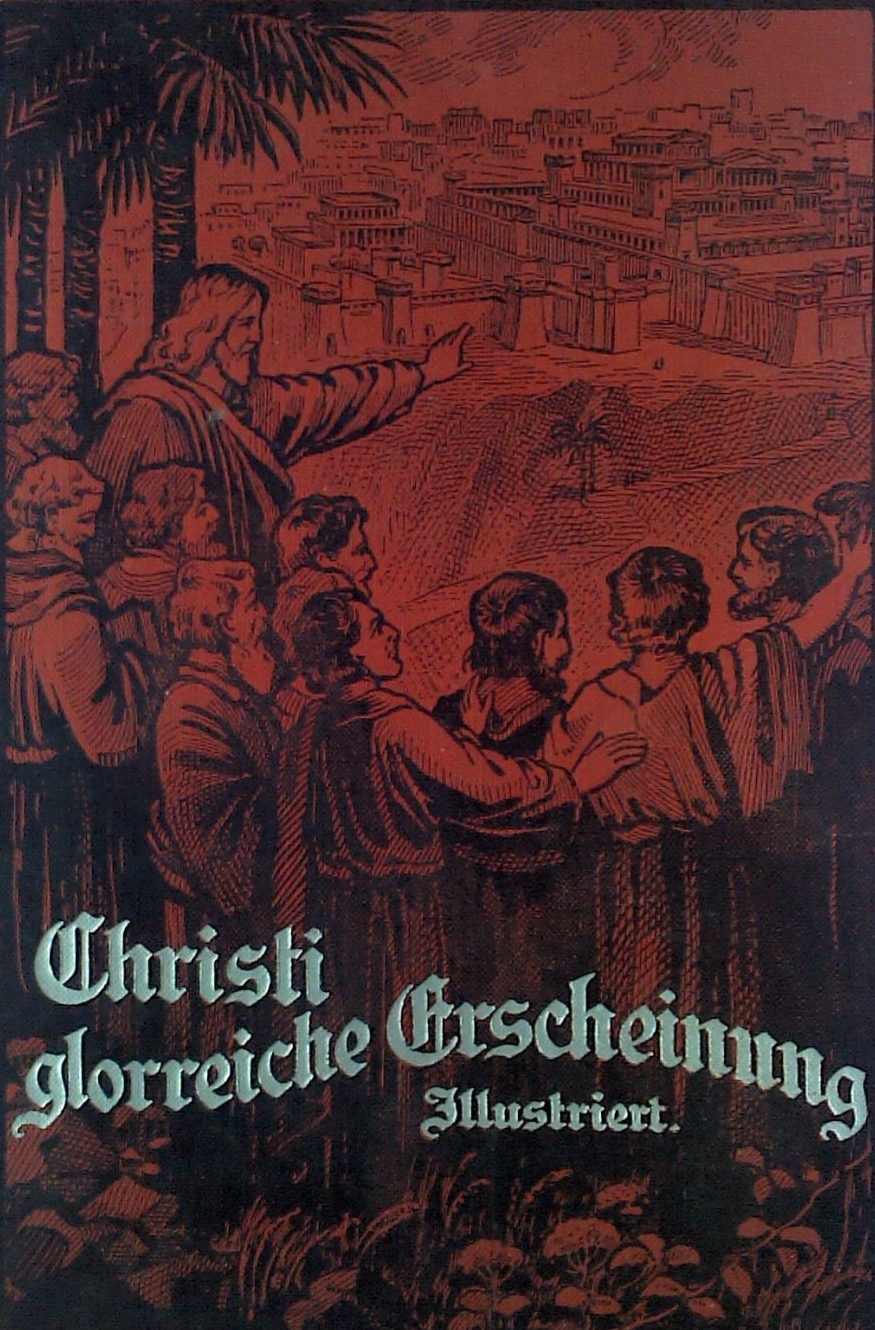 Schon 1912 betonte man mit dem Hinweis „Illustriert“ in silberner Schrift auf dem Cover von „Christi glorreiche Erscheinung“ den Wert der Abbildungen, die bei Adventisten mehr als reines Ornament sind. Ansonsten ist alles in blaue Farbe getaucht. Oben links erscheint zwischen den Wolken eine vielgestaltige Stadtlandschaft, vor allem tempelartige Bauten und Kirchtürme lassen sich unterscheiden. Umzogen ist die Stadt von einer rechteckigen Stadtmauer, in deren Ecken Türme gesetzt sind. Das aufgeschlagene Buch vorne spielt auf den Untertitel an: „Eine Klarlegung von Matthäus Vierundzwanzig“ (Matthäusevangelium Kap. 24: Rede über die Endzeit, Matthäusapokalypse).