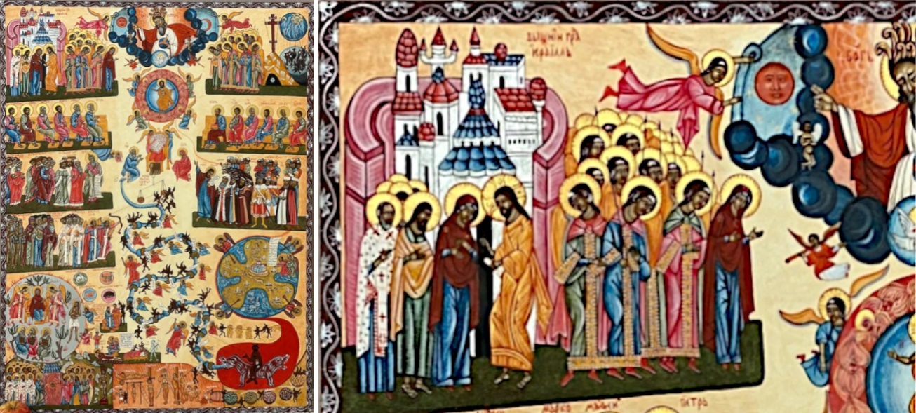 Dieses kleine Detail von etwa 40 x 65 Zentimeter stammt von einer alten Ikone aus der Ukraine, genaugenommen aus einer orthodoxen Kirche oder einem Kloster aus Mshanets bei Turka, einer westukrainischen Stadt in den Waldkarpaten. Insgesamt hat die Weltgerichtsikone eine Größe von 187 x 134 Zentimetern. Sie basiert auf Temperafarben und entstand um 1500. Im 20. Jahrhundert kam sie im Zuge der Religionsverfolgungen in den Staatsbesitz der Sowjetunion und heute befindet sie sich im Andrey Sheptycky Nationalmuseum in Lemberg (Lwiw). Sie ist dort ein prominentes Beispiel für die Darstellungsweise des Neuen Jerusalem in der Ostkirche.