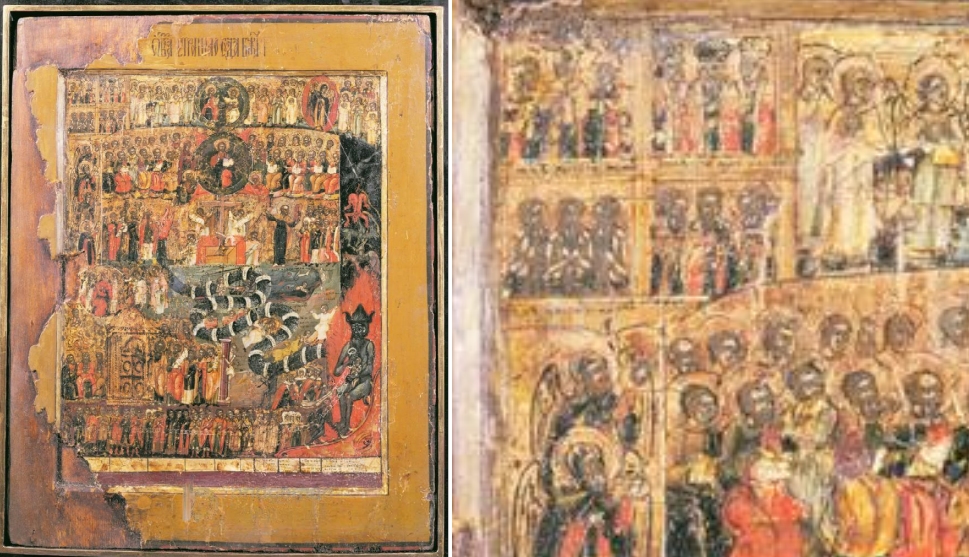 Zu sehen ist eine komplette russische Weltgerichtsikone, geschaffen um das Jahr 1820. Sie wird heute im Historischen Architektur- und Kunstmuseum zu Rybinsk aufbewahrt, in der Oblast Jaroslawl nördlich von Moskau. Sie ist dort ein Glanzstück der religiösen Sammlungen und wird kurz „Rybinsk-Ikone“ genannt. Die Malerei befand sich einst in einer Kirche oder einem Kloster der russisch-orthodoxen Glaubensgemeinschaft. Entstanden ist sie vermutlich im nahe gelegenen Jaroslawl, das eine produktive Ikonenmalschule besaß (dort entstand schon um 1660 ein dieser Ikone im Aufbau ähnliches Weltgericht).
