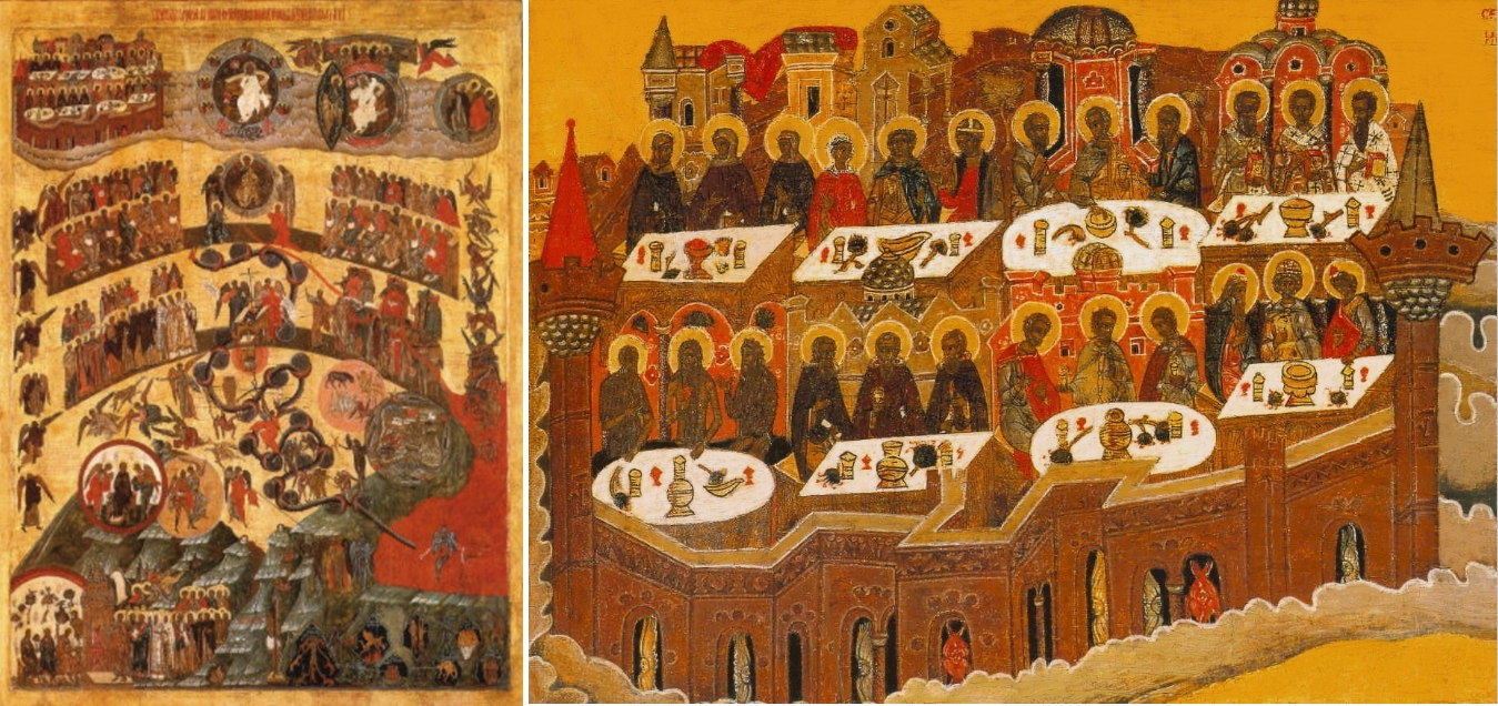 Die Ikone auf Basis von Temperafarben hat eine Gesamtgröße von 178 x 144 Zentimeter. Das Himmlische Jerusalem findet man auf dem Bild oben links, vollständig umzogen vom blauschwarzen Firmament. In der Stadt sind die Geretteten zum ewigen Abendmahl in acht Gruppen zusammengefasst: Apostel, Märtyrer (auf zwei gedeckte Tische verteilt), dann auch Mönche, Eremiten, Propheten, Bischöfe und sogar heilige Frauen. Umzogen sind sie von einer ornamentierten grünen Stadtmauer. In etwa der Hälfte der Tore stehen rotfarbene Wächterengel, die sorgsam den Zutritt in die heilige Stadt reglementieren. Die Tore dazwischen scheinen unbewacht offen zu stehen. In ihnen wächst jeweils eine langstielige Blume, was man nur auf sehr wenigen Darstellungen der Stadtmauer wird finden können (ausnahmsweise auf der Handschrift F.98 Nr. 679, fol. fol. 205v und 207v). Die dunkelgrüne Mauer um die Stadt springt im Zackenstil vor und zurück und ergibt einen polygonalen Stadtumriss, was für russische Ikonen nicht selten ist (im Gegensatz zum Quadrat, das man so gut wie nicht findet). Sie ist jedoch, für eine Ikone des 16. Jahrhunderts, detailreich geschmückt und ornamentiert.