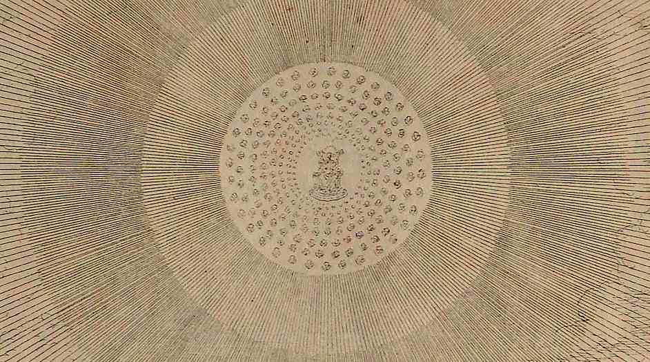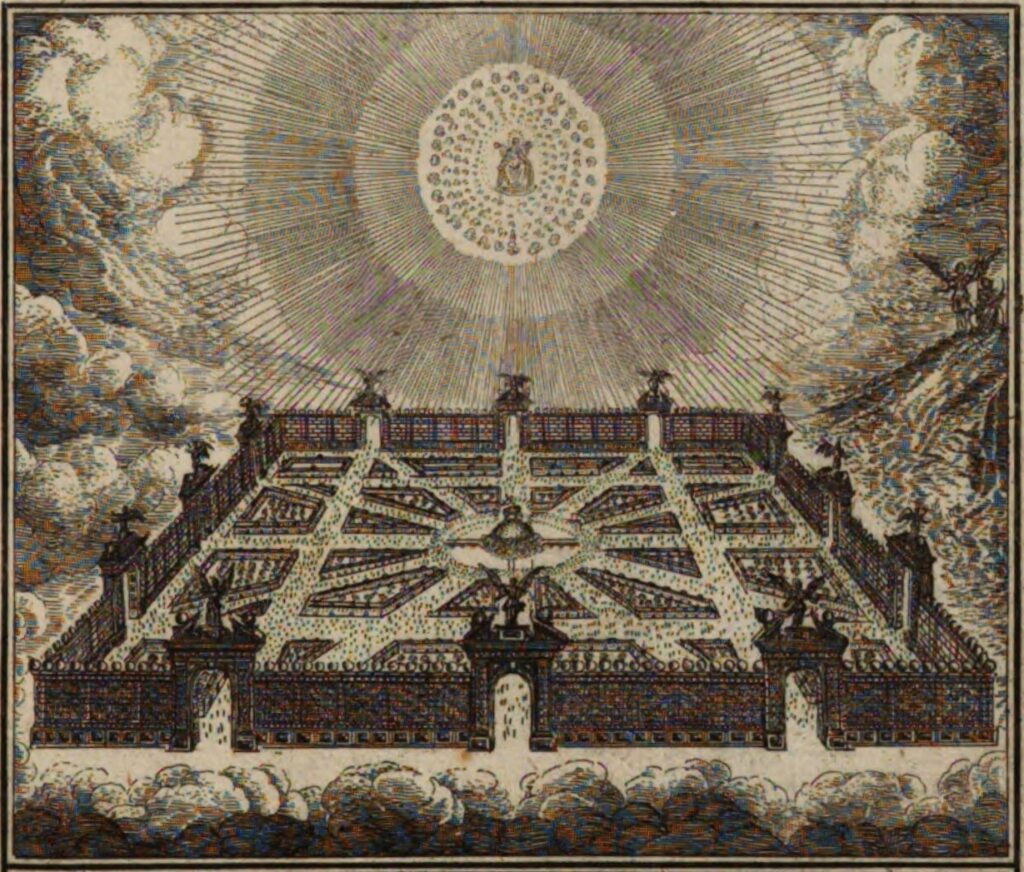 Johann Ulrich Kraus (1655-1719) war ein Meister der Vielfalt und wahrer Alleskönner; er war in der Lage, Themen in ganz unterschiedlichen Stilen zu liefern. Als anerkannter Kupferstecher kam er um das große Thema Neues Jerusalem natürlich nicht herum: Erstmals präsentierte er diesen Gegenstand 1694 in dem Werk „EngelsKunstwerk“ in einer Kartusche im barocken Stil. 1706 legte er in zwei Teilen das Werk „Augen- und Gemüthslust“ vor, welches gleichfalls zwei Mal das Himmlische Jerusalem enthält. Beide Arbeiten würde man heute als Plagiat anprangern; einmal ist es ein Stich nach Juan Bautista Villalpando, ein andermal eine Kopie aus der Mortierbibel, was Kraus ganz unverfroren mit seinem Namen unterzeichnete – wie hätte er auch wissen können, dass hunderte Jahre später Wissenschaftler mit digitalen Möglichkeiten solche Kopien leicht aufdecken können? Vielleicht wäre es ihm aber auch egal gewesen.