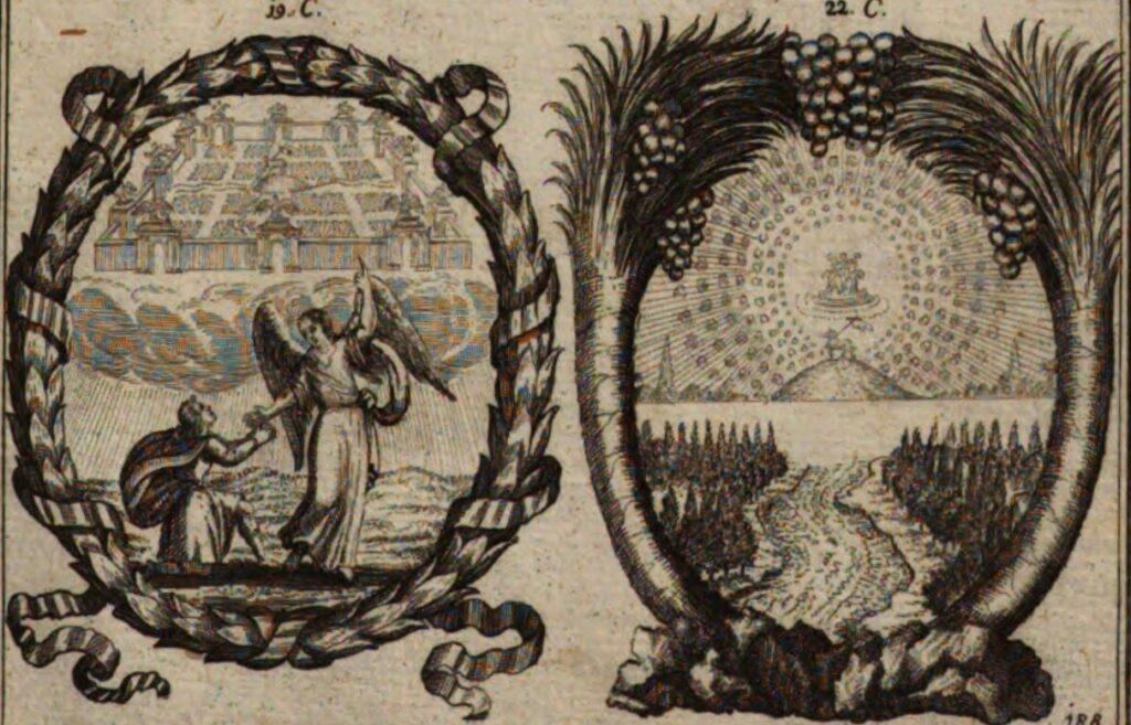 Auf Blatt 188 hat Kraus noch zwei weitere Stiche hinzugefügt, nach dem Motto: Aller guten Dinge sind drei. Es sind frühbarocke Kartuschen mit fantasiereicher Rahmung. Die linke zeigt in einer Allegorie nochmals die Stadt als Viereck mit zwölf Toren, davor eine Person, die vor einem Engel niederkniet. Dieser zeigt dem Demütigen die Stadt als Zeichen der Hoffnung. Die rechte hingegen thematisiert Gott auf dem Thron (wie bereits im oberen Kupferstich), der über dem Zionsberg mit dem Lamm und der Siegesfahne erscheint. Im unteren Bereich wird der Lebensfluss gezeigt, gesäumt von Bäumen, wie es vor allem später im 20. und 21. Jahrhundert populär werden sollte.