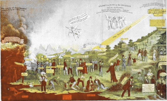 Gleichzeitig zu europäisch geprägten Beispielen des Zweiwegebildes bildete sich im urbanen Milieu der USA auch eine mehr und mehr eigenständige Interpretation des Zweiwege-Motivs heraus, zunächst in Pennsylvanien. Hier ist eine Version von „Broad and Narrow Road“ zu sehen, die von John W. Barber (1798-1885) in New Haven um 1860 geschaffen wurde. Seine Version des Zweiwegebildes weist auch freimaurerische Details auf; das Himmlische Jerusalem oben rechts ist in neoklassizistischer Architektur gehalten wie die Regierungsbauten der noch jungen USA.