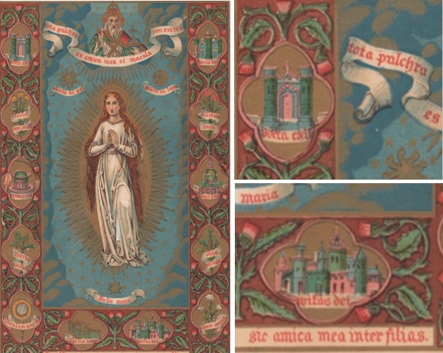 Über das ganze 19. Jahrhundert war eine anonyme Farblithographie verbreitet, die lateinisch „Virgo Immaculata“ betitelt ist. Wie üblich, findet man auf solchen Devotionalien das Himmlische Jerusalem zweimal: Einmal mittig links als zweitürmige Himmelspforte, und dann unten rechts als farbenfrohe Civitas Dei. Die Manier dieses historistischen Erzeugnisses soll an das 16. Jahrhundert an die Drucke von Thielman Kerver anknüpfen, daher wurden auch die lateinischen Spruchbänder eingefügt, obwohl die große Zeit des Latein längst zu Ende war. Vertrieben wurde dieses Einzelblatt als Andenken vor allem an Wallfahrtsorten in Frankreich und in Italien.