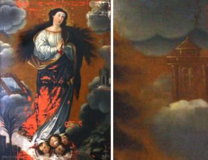 Unter den zahlreichen Ölgemälden im Besitz des Kolonialmuseums Bogotá befindet sich auch ein Werk in beschädigtem Zustand. Aus diesem Grund wird es selten ausgestellt und ist selbst Fachleuten kaum bekannt. Leider wissen wir über die dennoch hochwertige Malerei wenig; Maler und Auftraggeber sind ebenso unbekannt wie der Herstellungsort und das genaue Jahr. Auch liegen die Entstehungshintergründe wie so oft im Dunkeln. Geschätzt werden darf, dass diese Darstellung der Maria Immaculata im 17. Jahrhundert im Vizekönigreich Neuspanien entstanden ist. Oben links hat der Maler eine fein gearbeitete hellbraun-rosafarbige Himmelspforte im Barockstil gesetzt, deren zwei Flügeltüren fest geschlossen sind. Sie ist nicht, wie üblich, von Wolken umgeben, sondern der blaue Himmel hat sich rund um die Pforte geöffnet. Üblicherweise haben diese Pforten einen Dreiecks- oder Segmentgiebel, hier sind es drei Zinnen.