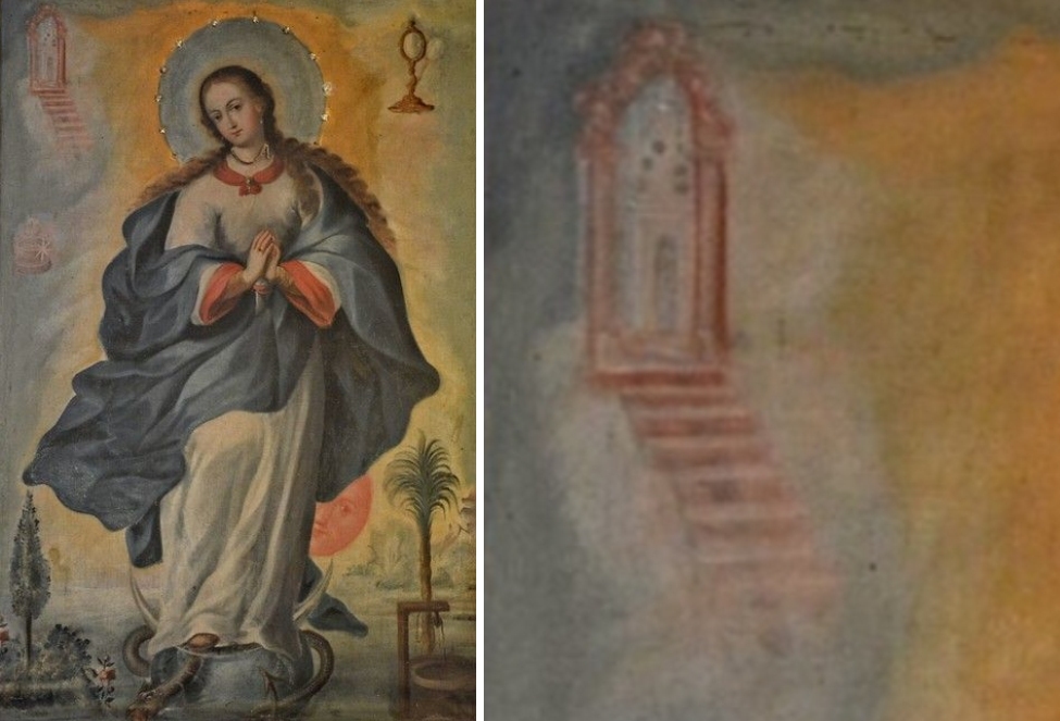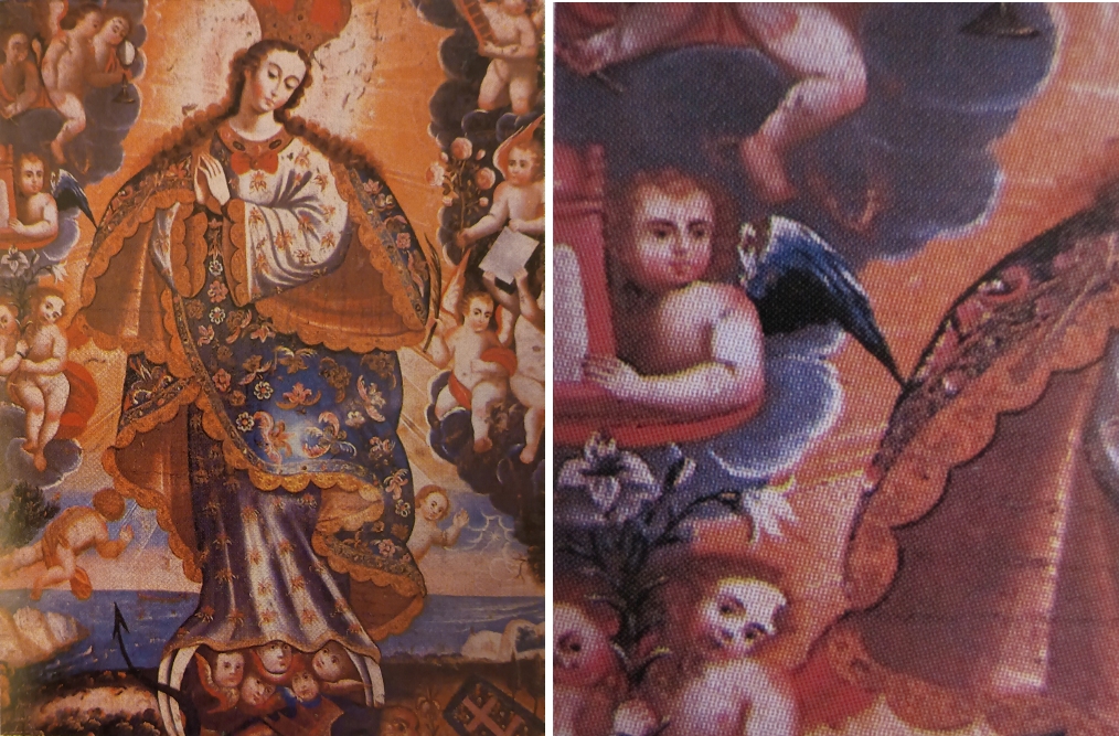 Die Universität San Antonio Abad in Cusco (Peru) besitzt ein eigenes Inkamuseum, in dem auch viele Gegenstände der spanischen Kolonialbesatzer ausgestellt sind. Darunter fällt eine Darstellung der Maria Immaculata aus dem späten 17. Jahrhundert, die in Cusco angefertigt worden sein soll. Der unbekannte Meister hat auf der linken Seite des Bildes verewigt, wie ein Engel der gerührten Maria eine Himmelspforte präsentiert. Ähnlichkeiten bestehen zu Werken von José Rodriguez Carnero oder Juan Rodriguez Juárez, eine solche Darstellungsweise war um 1700 populär.