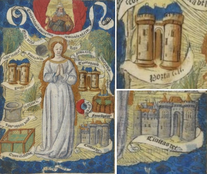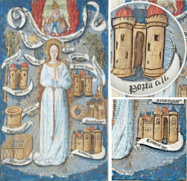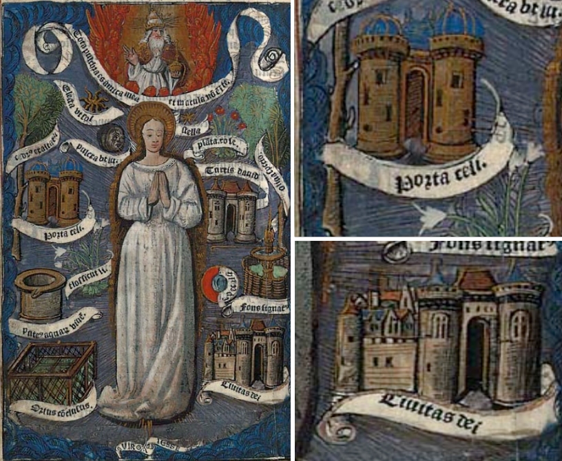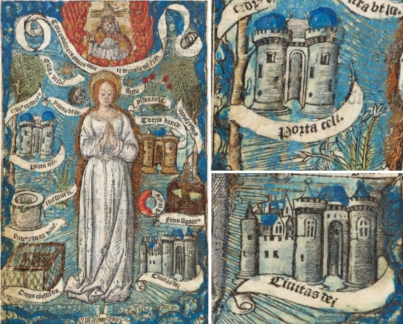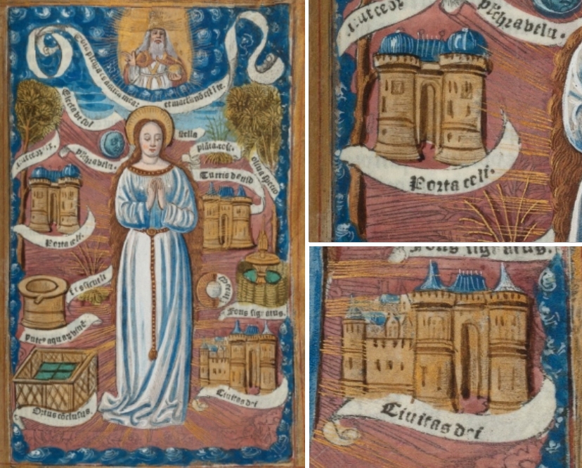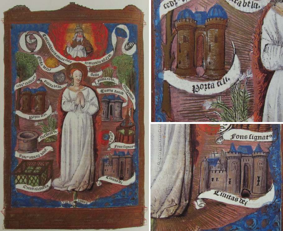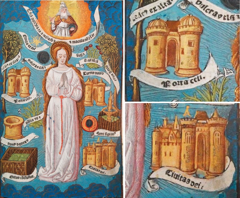 Links neben der stehenden Marienfigur ist die Himmelspforte zu sehen, rechts unten die Gottesstadt. Alle Architekturen, einschließlich des Davidturms, sind ähnlich als zweitürmige Schlossanlage mit rotbrauner Fassade und blauen Dächern gestaltet. Die farbige Illustration befindet sich ganzseitig fast am Ende des Buches. Es existiert keine durchgängige Seitenzählung, in diesem Fall gibt es rechts unten auf der Seite jedoch eine Paginierung /mi/, auf der folgenden Seite die Angabe /mii/.