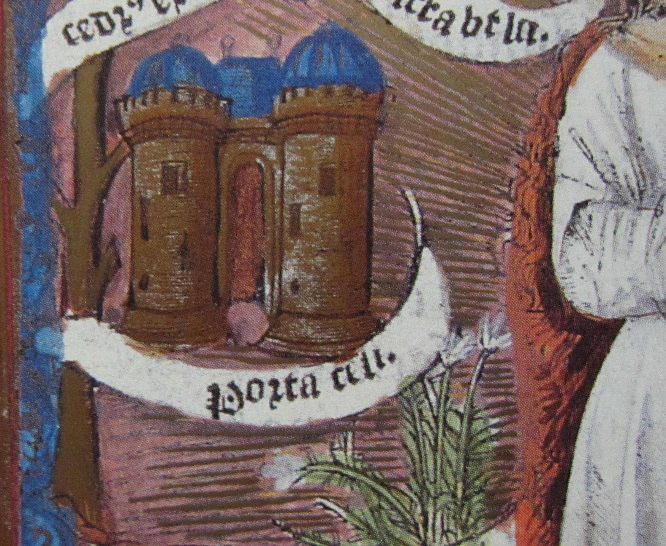 Links neben der stehenden Marienfigur ist die Himmelspforte zu sehen, rechts unten die Gottesstadt. Alle Architekturen, einschließlich des Davidturms, sind ähnlich als zweitürmige Schlossanlage mit rotbrauner Fassade und blauen Dächern gestaltet. Die farbige Illustration befindet sich ganzseitig fast am Ende des Buches. Es existiert keine durchgängige Seitenzählung, in diesem Fall gibt es rechts unten auf der Seite jedoch eine Paginierung /mi/, auf der folgenden Seite die Angabe /mii/.