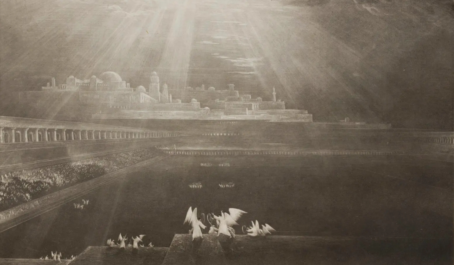 Mehrere dieser Drucke haben sich in der Royal Academy of Arts in London erhalten. Eines der Werke lautet „Heaven – The Rivers of Bliss“. Hier ist die Gottesstadt als Burganlage unter einer weißen Gloriole zu erkennen. Das 35 x 25 Zentimeter große Werk entstand 1824/25 aus der Serie zu „Paradise Lost“ (11. Buch) und hält sich eng an die Textvorlage. In einer späteren Version dieses Druckes wurde die Stadtvision ganz herausgenommen.