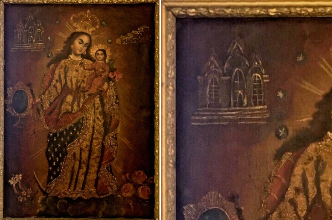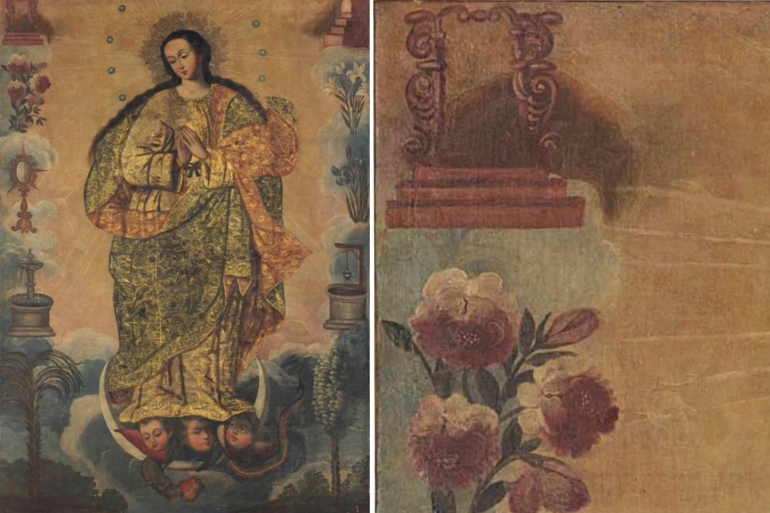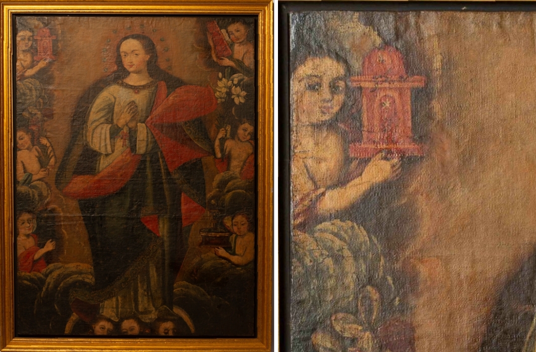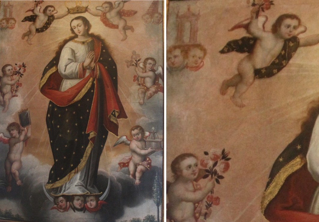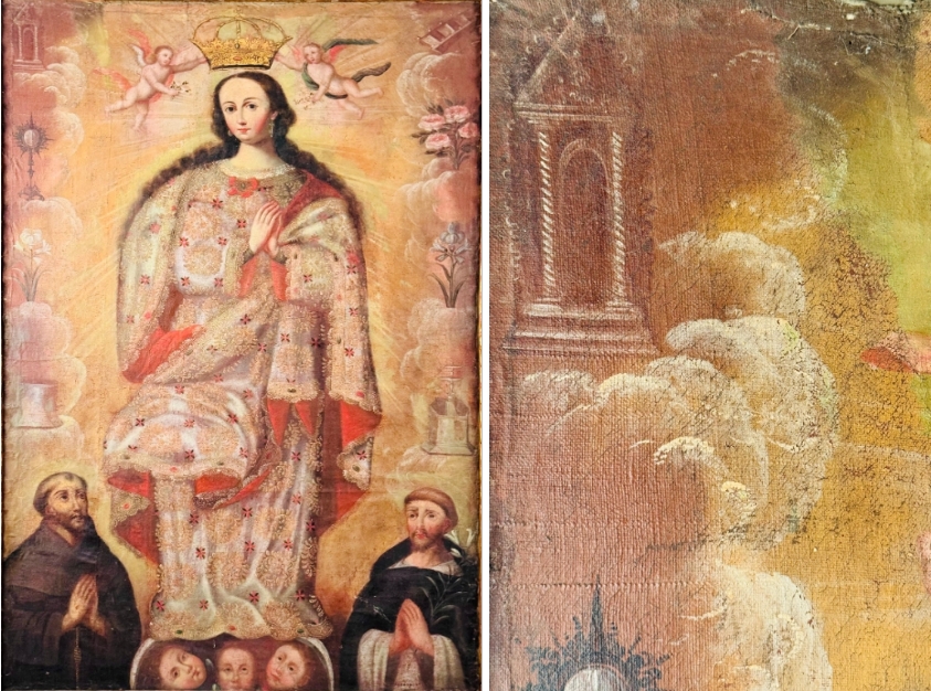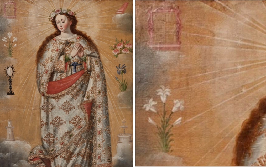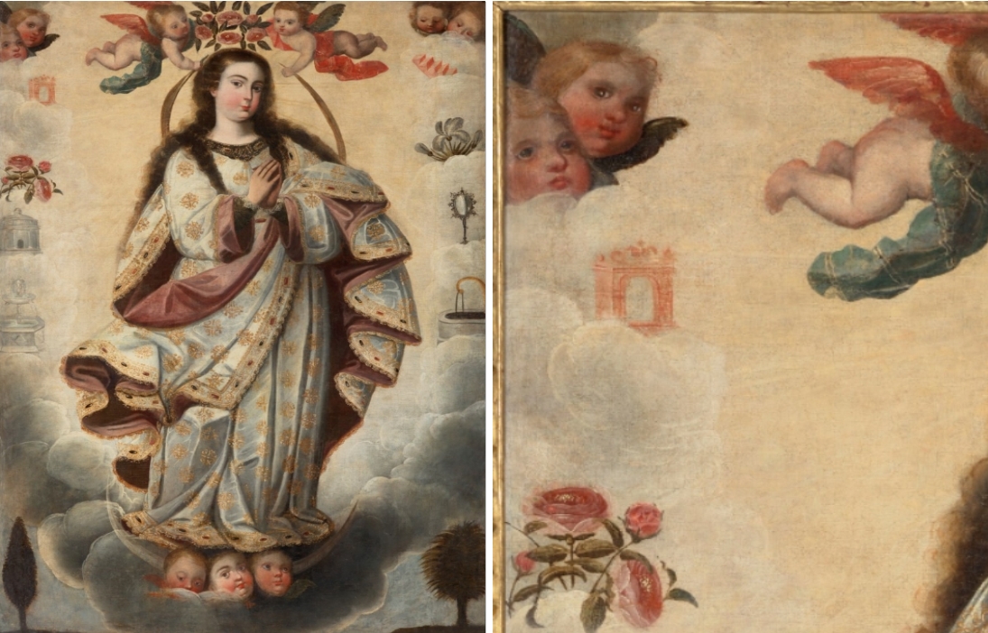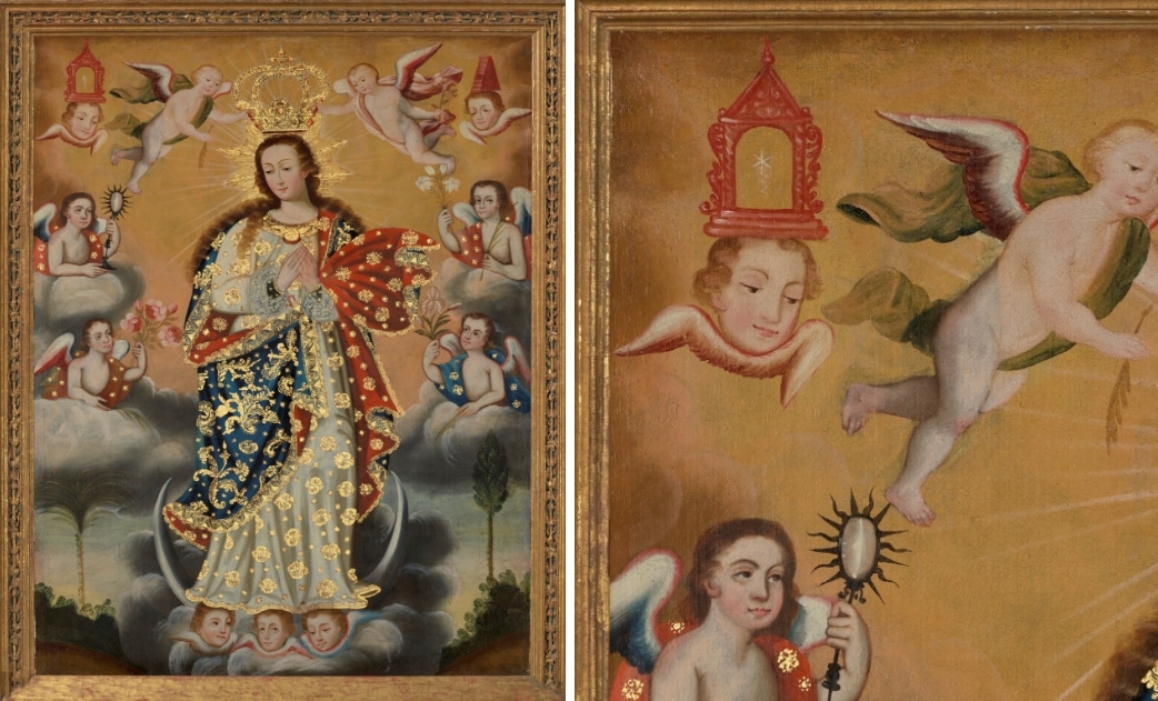 Eine Fassung der Immaculata aus der peruanischen Cusco-Malerschule zeigt in der oberen linken Ecke mit lediglich wenigen weißen Linien (ähnlich wie auf dem Beispiel aus dem Kloster Santa Catalina) eine zarte, ungewöhnlich schmale Himmelspforte zwischen den Wolken. Die Säulen setzen sich aus kleinen, übereinander gesetzten Strichen zusammen, wie ein anderes Beispiel aus dem späten 18. Jahrhundert aus Zinacatepec. Die 166 x 107 cm Zentimeter große Ölmalerei eines nicht namentlich bekannten Meisters stand beim US-amerikanischen Auktionshaus Skinner 2019 zum Verkauf an und zeigt eine Tendenz an: Immer mehr Kunstwerke aus den südlichen amerikanischen Ländern wandern in private Sammlungen der westlichen Länder. Über Beutekunst wird viel diskutiert, über die Problematik des neokolonialistischen Auktionärsunwesens wird meist geschwiegen.