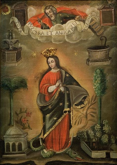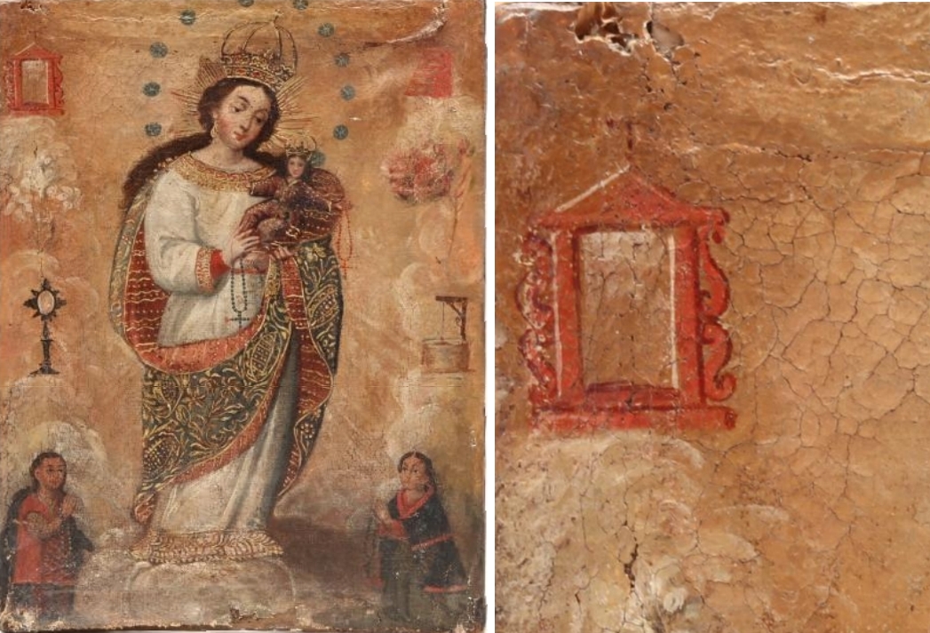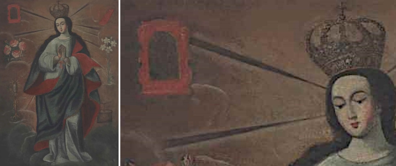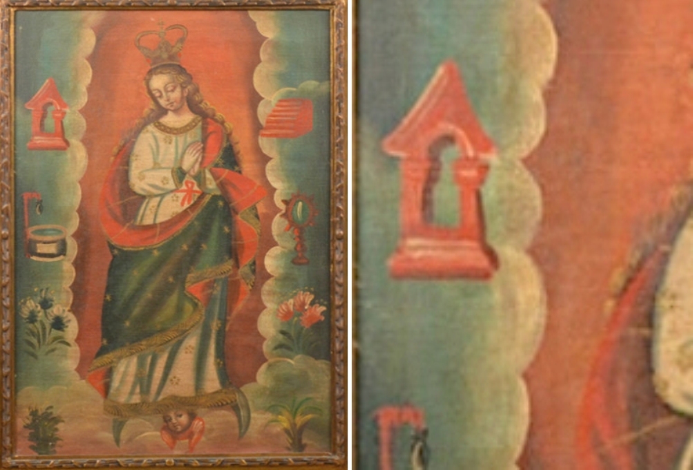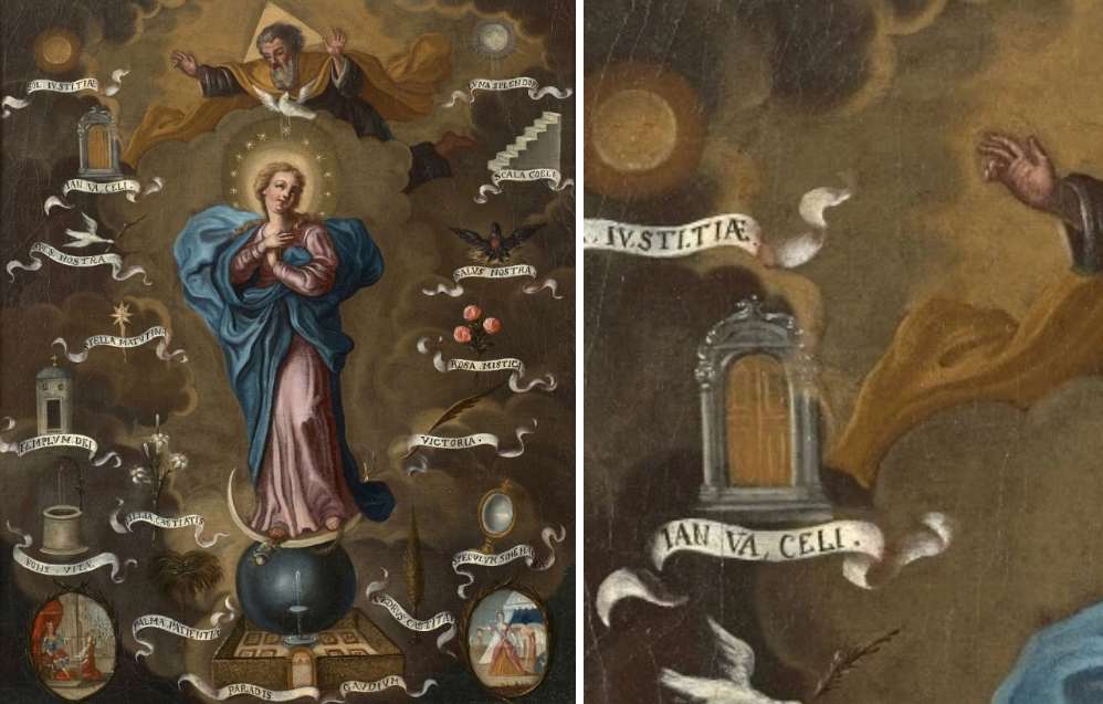 2015 wurde eine Ölmalerei versteigert, die im 18. Jahrhundert in Peru entstanden ist, vermutlich für eine Kirche oder ein Kloster. So schnell wie die anonyme Arbeit auftauchte, ist sie nach der Auktion auch wieder verschwunden und steht der weiteren wissenschaftlichen Arbeit nicht länger zur Verfügung. Es handelt sich um eine Darstellung der Maria Immaculata in der Größe 152 x 107 Zentimeter. Oben links hat ein unbekannte Meister eine rotfarbene Pforte im barocken Stil eingefügt.