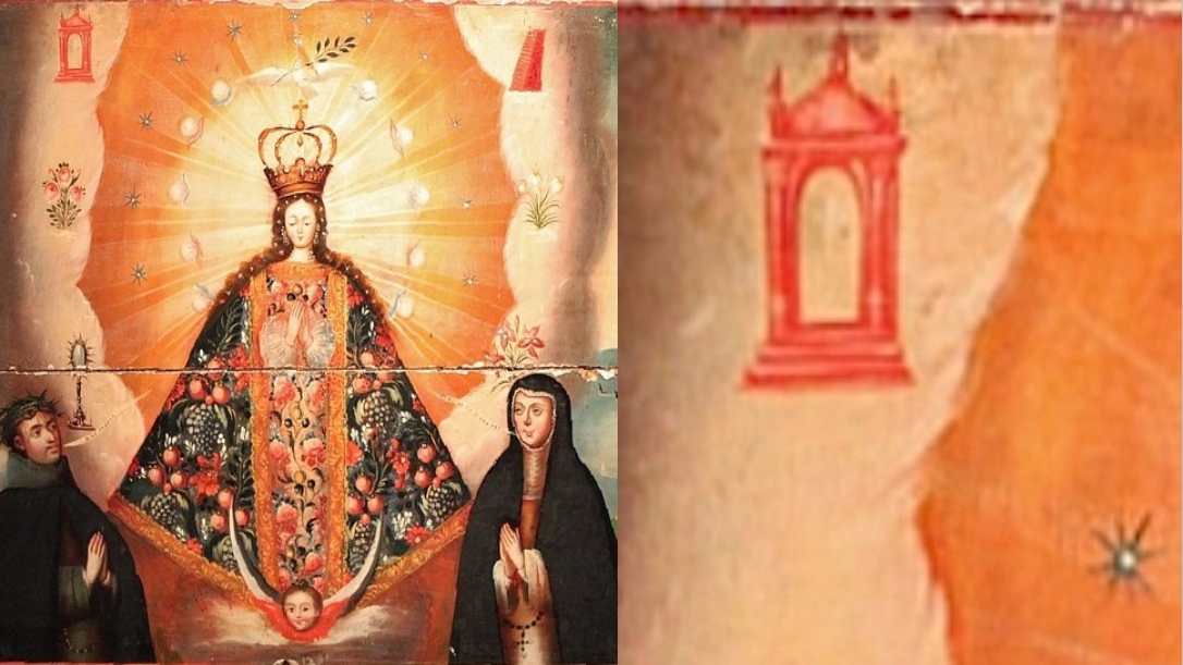 Um 1740 entstand in Cusco diese Ölmalerei als Auftrag für eine wohlhabende Handelsfamilie in Montamoros, später wurde sie nach Kanada verkauft. Das charakteristische dieser Malerei sind die fünf ausgewählten Marien-Motive, eher grob und schnell aufgesetzt, die mit Goldfarbe akzentuiert wurde. Mit Sicherheit stammen sie von einer anderen Hand als die Marien- und Jesusfigur mit weichen, akademisch geschulten Gesichtszügen. Links oben findet man ein Objekt zwischen Kirche, Himmelspforte und Gottesstadt: Über breiten Stufen, die an das Edelsteinfundament der Stadt anlehnen, erheben sich drei Rundbögen, die im inneren ein Raster zeigen, offensichtlich die Kassetten oder Flügel von Türen. Über ihnen erheben sich Kuppeln, wiederum darüber Dreieckgiebel, so dass eine Dachlandschaft entsteht.