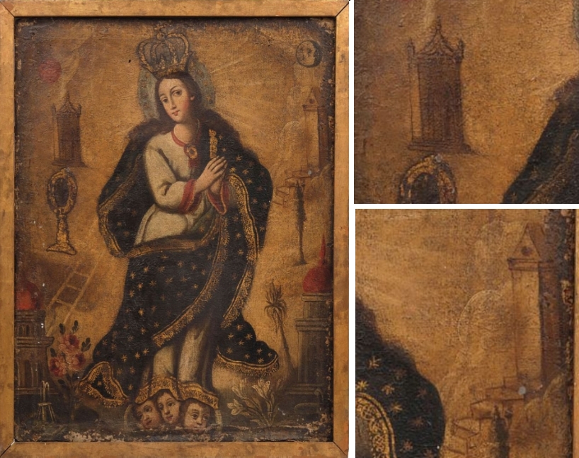 Dieses Ölgemälde aus der Cusco-Malerschule ist bezüglich des Themas eine Rarität. Im oberen Bereich wird gleich drei Mal (!) eine Himmelspforte dargestellt: eine rote Pforte links, ihr gegenüber rechts eine zweite rote Pforte, und darunter eine dritte, diesmal helle gelbgoldene Pforte. Alle drei Pforten sind im Barockstil gehalten und stehen offen. Keine andere Darstellung der Maria Immaculata zeigt dieses Motiv öfters als dieses 128 x 87 Zentimeter große Gemälde, das um 1710 entstanden ist und 2013 auf dem Kunstmarkt versteigert wurde. So gut wie immer sind es angloamerikanische Auktionshäuser, während die lateinamerikanischen Länder ihre eigenen Pretiosen, Kultur und Geschichte für ein paar Dollar verkaufen (müssen?).