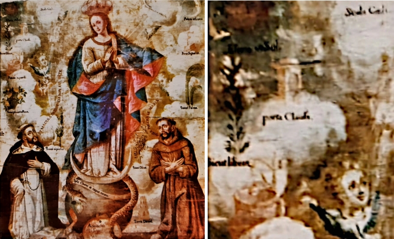 Auf einem Ölgemälde der Maria Immaculata regnet es im oberen Teil Blüten. Im unteren Teil sind dagegen viele Symbole Mariens versammelt, ganz links die offene Himmelspforte auf einer Anhöhe, am Ende einer Treppe. Rechts hat der Maler die geschlossene Pforte gesetzt. Beide Bauwerke sind nicht gut zu erkennen, da die helle Pforte von einem hellen, die dunkle Pforte von einem dunklen Hintergrund umgeben ist. Dazwischen schieben sich zahlreiche Bauten der Civitas Dei, ausgestaltet wie eine Küstenstadt des 18. Jahrhunderts. Auffällig ist vor allem ein schlanker Turm, der an die Giralda von Sevilla denken lässt. Das Bild ist um 1720 entstanden, unter Mitwirkung eines großen ecuadorianischen Meisters. Es befindet sich derzeit in der Kunstsammlung des römisch-katholischen Klosters Carmen de San José in Quito (Ecuador).