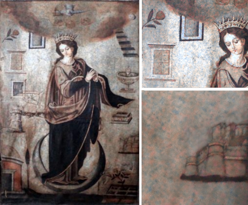 Was die Mariensymbole angeht, bietet die Cusco-Malerschule durchaus Abwechslung und Variantenreichtum. Diese Malerei befindet sich heute im Nationalen Kunstmuseum Brasiliens in Rio de Janeiro. Außer dass die Arbeit im 18. Jahrhundert Neuspanien entstanden ist weiß man nichts weiter über Auftraggeber, Herkunft oder gar Entstehungshintergrund. Allein die Größe ist gesichert: 148 x 88 Zentimeter. Einen eigenen Forschungsstand gibt es zu den wenigsten Bildnissen der Maria Immaculata, selbst Literatur ist kaum vorhanden, wie auch in diesem Fall. Die geschlossene klassische Himmelspforte mit Säulen und Dreiecksgiebel befindet sich auf dem Bild in der linken oberen Ecke. Auf gleicher Seite, etwa in der Mitte, ist hier auch einmal eine Civitas Dei eingefügt worden, als Miniaturstadt mit eng aneinander gesetzten Häusern hinter einer Stadtmauer mit Bollwerk und Zugangspforte. Wo eine geschlossene Pforte ist, hat man überwiegend auch eine geöffnete hinzugesetzt, da die Menschen nicht auf die Hoffnung eines offenen Zugangs in das Neue Jerusalem verzichten wollten. Dieser befindet sich mittig rechts, als mittelalterliches Stadttor mit zwei niedrigeren Rundtürmen zwischen dem Hauptturm mit der Pforte, als Rückgriff auf Darstellungen des 16. Jahrhunderts, etwa von Benvenuto Tisi Garafalo oder Antonio Stabile.