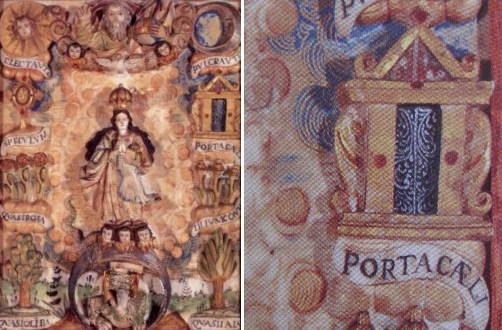 Diese leicht schräg gestellte Himmelspforte gehört zu einem Ölgemälde der Maria Immaculata, welches erst 2013 der Öffentlichkeit bekannt wurde, als es zur Versteigerung bei Christie’s anstand. Die Arbeit ist im 18. Jahrhundert in der bekannten Malerschule von Cusco entstanden, von einem unbekannten Meister ausgeführt. Die Pforte belegt: Im 18. Jahrhundert wurde sie nicht immer im Barockstil präsentiert, sondern auch einmal klassisch-einfach wie Jahrhunderte zuvor.