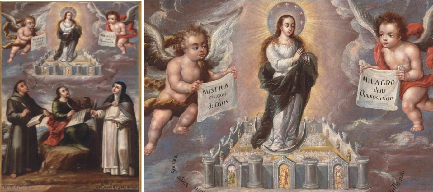 Die Schrift „Mystica Ciudad de Dios“ („Die mystische Stadt Gottes“) erschien 1670 erstmals dreibändig in Madrid. Die Verfasserin des Buches, María de Jesús de Ágreda (1602-1665) war eine Visionärin und Äbtissin des Franziskanerinnenkonvents in der spanischen Ortschaft Ágreda. Der Druck war in Spanien und Neuspanien ein großer Erfolg und traf anscheinend genau die Frömmigkeitsbedürfnisse der Zeit. Es gab gegen Ende des 17. Jahrhunderts mehrere Nachdrucke, von denen einige auch Illustrationen des Himmlischen Jerusalem beinhalten. Zu Ende des 17. und Beginn des 18. Jahrhunderts wurde „Mystica Ciudad“ auch in Ölmalereien vertrieben. Es entstand ein eigenständiger Bildtyp, den man sofort als „Mystica Ciudad“ erkennt.