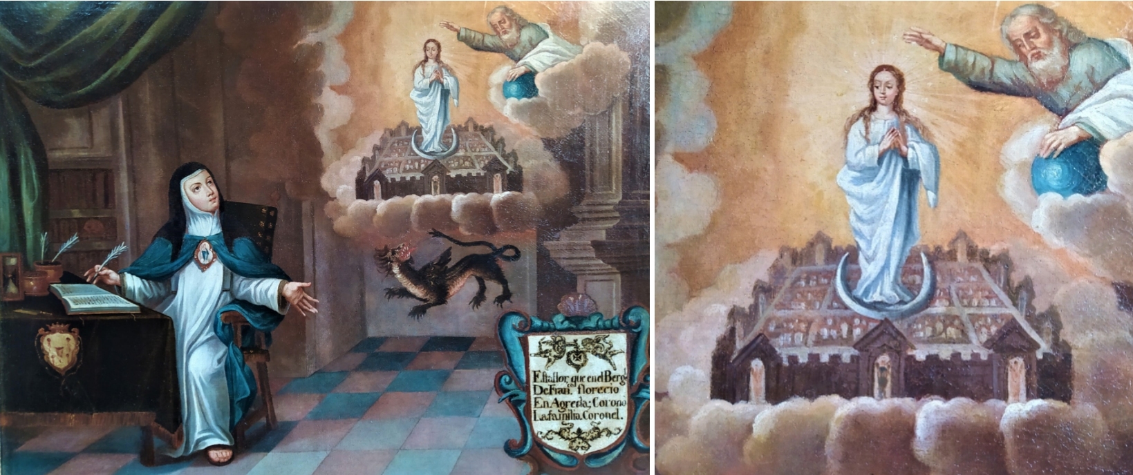 Zufall oder Fügung, um diese Zeit entstand noch eine weitere Malerei zum Thema. Diese Fassung als Ölgemälde der „Mystica Ciudad“ stammt ursprünglich aus dem Kloster Santa Maria Magdalena des Ortes Cuitzeo in der Region Porvenir, Méxiko. Der anonyme Maler schuf dieses Werk, dem man Titel wie „Defensa Inmaculista“ oder auch „Imaculada Conceição ladeada por São Francisco de Assis, São Evangelista e Santa Beatriz de Silva“ gegeben hat, wohl kurz nach 1706 bereits im Rokokostil. Der Bildaufbau ist wieder deutlich der Urfassung angeglichen, doch anstatt eines klassizistischen Himmlischen Jerusalem erscheint hier eine Stadt, die in lodernden, bewegten Flammen zu stehen scheint: Die Linien haben sich aufgelöst, barocke Schwünge und eine neue Dynamik kennzeichnet die Stadtdarstellung. Anhand dieses Charakteristikums sollte es zukünftig gelingen, den Maler dieser durchaus qualitätvollen, akademisch geschulten Arbeit herauszufinden, die sich heute im Museum für Kunst und Religion in Santa Mónica, Puebla (Mexiko) befindet.
