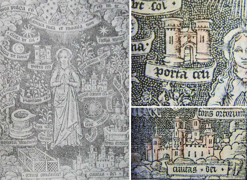 Auch in der Folgeausgabe 1503 (1504) präsentieren bei unveränderter Gesamtkonzeption diese beiden Symbole das Himmlische Jerusalem. Weiterhin ist einer der beiden Türme der Pforte etwas kleiner und die Gottesstadt von Wolken umzogen. Diese Fassung wurde mit einer hellen Rottönung koloriert, was eine beliebte Möglichkeit war, ohne großen Aufwand den Illustrationen etwas Farbe zu verleihen.