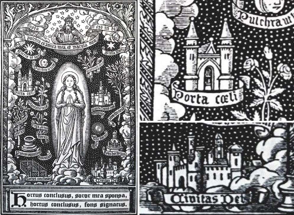 Oben haben wir eine Gesamtansicht einer besonders prächtigen Ausmalung (fol. qi), die zahlreiche Symbole Mariens auf tiefblauem Grund mit weißen Spruchbändern zeigt. Diese bringen ihre Tugenden zum Ausdruck, wie ein Paradiesgarten, ein Brunnen, eine Rose oder ein Spiegel. Das Himmlische Jerusalem erscheint zwei Mal: Als zweitürmige Himmelspforte bzw. Himmelstür (Porta Celi, also Coeli) und als vielgestaltige Civitas Dei, da Maria nach katholischer Auffassung auch die erste Schutzpatronin der Gottesstadt ist. Links der Marienfigur befindet sich die „Porta Celi“ mit zwei Rundtürmen, zwischen die eine kleine geschlossene Pforte geschoben ist. Unten rechts steht die „Civitas Dei“. Es ist eine Stadt auf blauen Wolken, die teilweise die hohen, weißen Stadtmauern verdecken.
