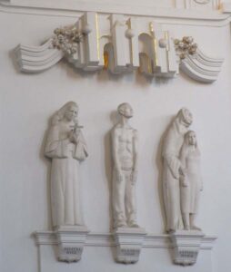 Sowohl die Perlen wie auch die Tore wurden von Elsässer und seinem Team jedoch ein zweites Mal dargestellt. So finden sich im Apsisbereich an der Wand mehrfach Dreiergruppen von Heiligen und Seligen, wie Julitta Reitz, Marcel Callo, Antonia Werr, Pius Keller, Georg Häfner, Adolf Schmitt u.a. – selbstverständlich alle katholisch. Himmlische Freude strahlen diese Personen nicht aus, die Gesichter sind ernst bis mürrisch, der Ausdruck in sich gekehrt, und, wie ich finde, wenig hoffnungsvoll. Über den Dreiergruppen findet man eine Art Dach oder Fries, der aus drei Perlen und Toren besteht. Farbe wurde bei dieser Installation nicht eingesetzt; alle Figuren und Objekte sind weiß und teilvergoldet. Die Figuren wirken wie aus den 1950er Jahren, entstanden aber ebenfalls 1987/88, wo neben Elsässer auch die Bildhauer Gerhard Heinrich Bücker, Willi Grimm, Tilmar Hornung, Ernst Singer und Lothar Forste mitarbeiteten. Nicht weniger als 36 Figuren sind so neu in den Dom gekommen.