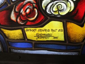 Ein prächtiges, aber selbst in Berlin wenig bekanntes Buntglasfenster befindet sich in dem römisch-katholischen Kloster Sankt Augustinus im Ortsteil Lankwitz. Es ist eine Arbeit von der Benediktinerin Erentrud Trost (1923-2004) aus dem Jahr 1995, ein Jahr vor der Weihung der Kapelle fertiggestellt. In dem reichhaltigen Schaffen der Künstlerin ist es ihre letzte künstlerische Arbeit, die das Himmlische Jerusalem thematisiert. Gewissermaßen hat sie hier viele Elemente früherer Arbeiten zu einer endzeitlichen Schau vereint. Vergleicht man es mit der kurz zuvor fertiggestellten Arbeit in Darleiden, dann gewinnt man den Eindruck einer regelrechten Bildexplosion. Eingebaut wurde es damals von der Glasmalerei Jostmann aus Paderborn.